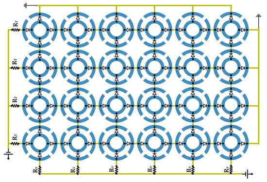 To experimentally validate the simulation results, a prototype with dimensions of 208.6 × 284.8 mm2 and substrate thickness of 1.575 mm was fabricated utilizing printed circuit board (PCB) technology on Rogers 5880 dielectric substrate. The prototype consists of 4 × 6 array of unit cells. For ON/OFF control of the PIN-diodes placed in either horizontal or vertical orientations, the DC bias required is supplied from the bottom layer to the top layer through vias. The prototype integrates BAP-5102 PIN-diodes, with 8 vertically oriented and 12 horizontally oriented diodes soldered at their designated locations. Each diode requires a forward voltage of approximately 0.7 V ( for forward biasing (ON state). The forward resistance of each PIN-diode is 1.5 Ω at a bias current of 10 mA. The current is limited to 10 mA ( by surface-mount resistors (SMDs), designated as for horizontal diodes and for vertical diodes, as illustrated in Figure 9. To bias the vertically oriented diodes with a DC voltage of 9 V , a resistor value of = 340 Ω is required, whereas for the horizontally oriented diodes, = 60 Ω is expected, where the calculation of and values is presented in Equation (1). Consequently, the nearest commercial resistor values are chosen: 68 Ω for and 330 Ω for .