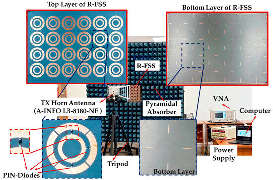 Frequency-selective surfaces (FSSs) are specifically designed to exhibit a frequency-dependent electromagnetic response, enabling them to selectively transmit desired electromagnetic signals while simultaneously attenuating or reflecting unwanted frequencies [1,2,3]. Today, FSSs are widely used for various purposes, including band-stop [4,5,6], band-pass [7,8,9], and absorptive functionalities [10,11,12,13], as well as for beam steering applications [14,15,16]. On the other hand, there is a growing demand for real-time frequency reconfigurability in FSSs. This is especially valid in critical scenarios, such as emergencies (e.g., earthquakes, disasters), or for enhancing data security. This need has driven the development of reconfigurable FSSs (R-FSSs), which are capable of dynamic frequency switching. R-FSSs achieve this reconfigurability by integrating active circuit elements such as Micro-Electromechanical Systems (MEMSs) [17,18], PIN-diodes [19,20,21,22], varactors [23,24], and liquid crystals [25,26]. PIN-diodes are preferred for their efficient switching, easy integration, and cost-effectiveness, making them ideal for reconfigurable frequency-selective surfaces. Their rapid switching speed and low insertion loss provide advantages over alternatives like varactors or MEMS, especially in broadband electronic switching and multiband shielding applications. In addition, PIN-diodes facilitate dynamic frequency control in frequency-selective rasorbers and RFID tag antennas by enabling state changes [27,28]. Additionally, rapid switching speed and low insertion loss of PIN-diodes make them suitable for broadband electronic switches and multiband shielding applications [29,30].