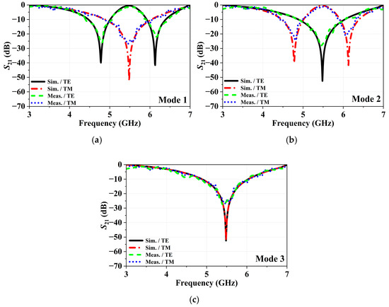 The measurement setup is given in Figure 10. For measurements, Anritsu MS4644A Vector Network Analyzer (VNA), capable of operating between 10 MHz and 40.5 GHz, is utilized. A TT Technic MCH303D-II DC power supply, with an adjustable output voltage range of 0–30 V, is employed to provide the required biasing voltage. The fabricated prototype is mounted in a cavity on a platform covered with pyramid absorbers, positioned between a pair of A-INFO LB-8180-NF horn antennas. To perform TM mode measurements, the sample is rotated 90° on the platform to ensure alignment with the desired polarization. Measurement results of R-FSS are given on Figure 11. The proposed structure exhibits measured band-stop characteristics with fractional bandwidths of 11.36% in the 4.43–4.97 GHz band and 6.78% in the 5.91–6.32 GHz band (Mode 1), and ~22.44% in the 4.82–6.03 GHz band (Mode 2 and 3) under TE polarization. For TM polarization, band-stop fractional bandwidths are 13.71% in the 4.41–5 GHz band and 8.95% in the 5.91–6.46 GHz band (Mode 2), and ~22.44% in the 4.85–6.07 GHz band (Mode 1 and 3).