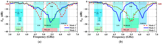 The corresponding frequency ranges of the proposed R-FSS are summarized in Figure 12. In one mode, the structure suppresses two narrowbands corresponding to the n79/n102d allocations, whereas in the other mode, it suppresses a wideband covering the WiMAX, WLAN, and n46 allocations.