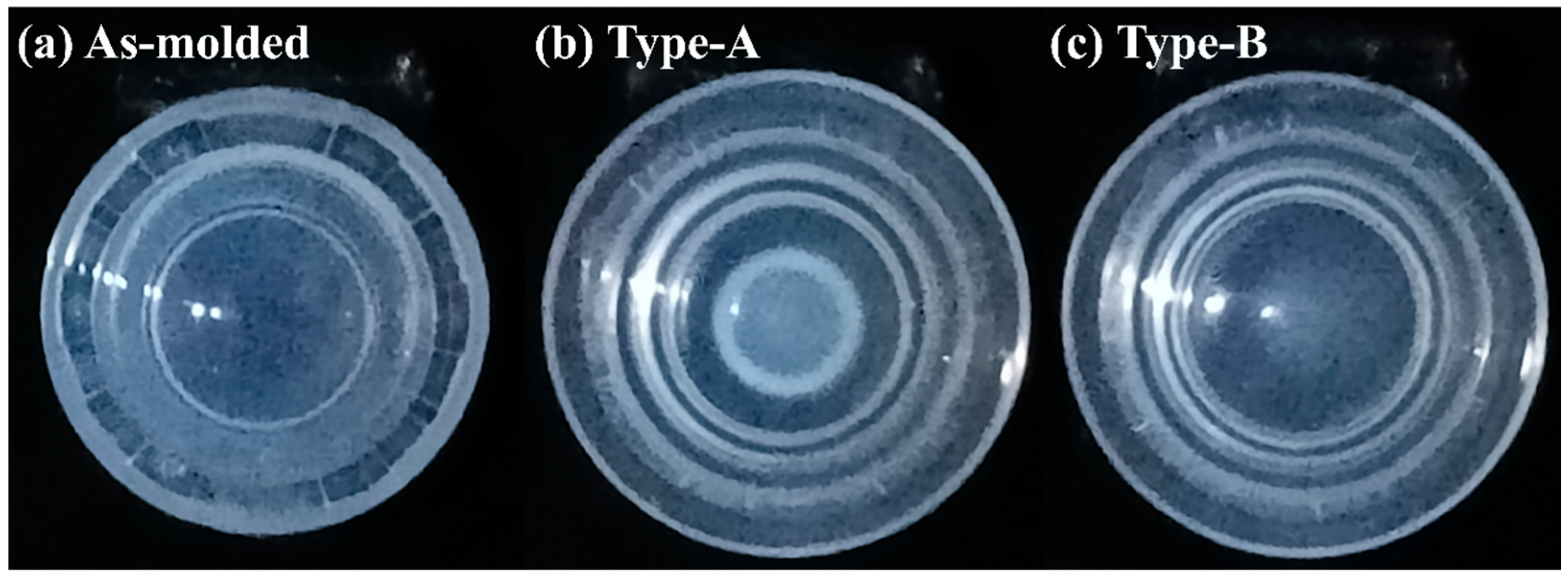 - Lukášk, J.; Fenclová, T.; Tyráčkková, V.; Vacík, J. The surface treatment of polypropylene molds and its effect on the quality of cast contact lenses. J. Appl. Biomater. 1992, 3, 275. [Google Scholar] [CrossRef] [PubMed]