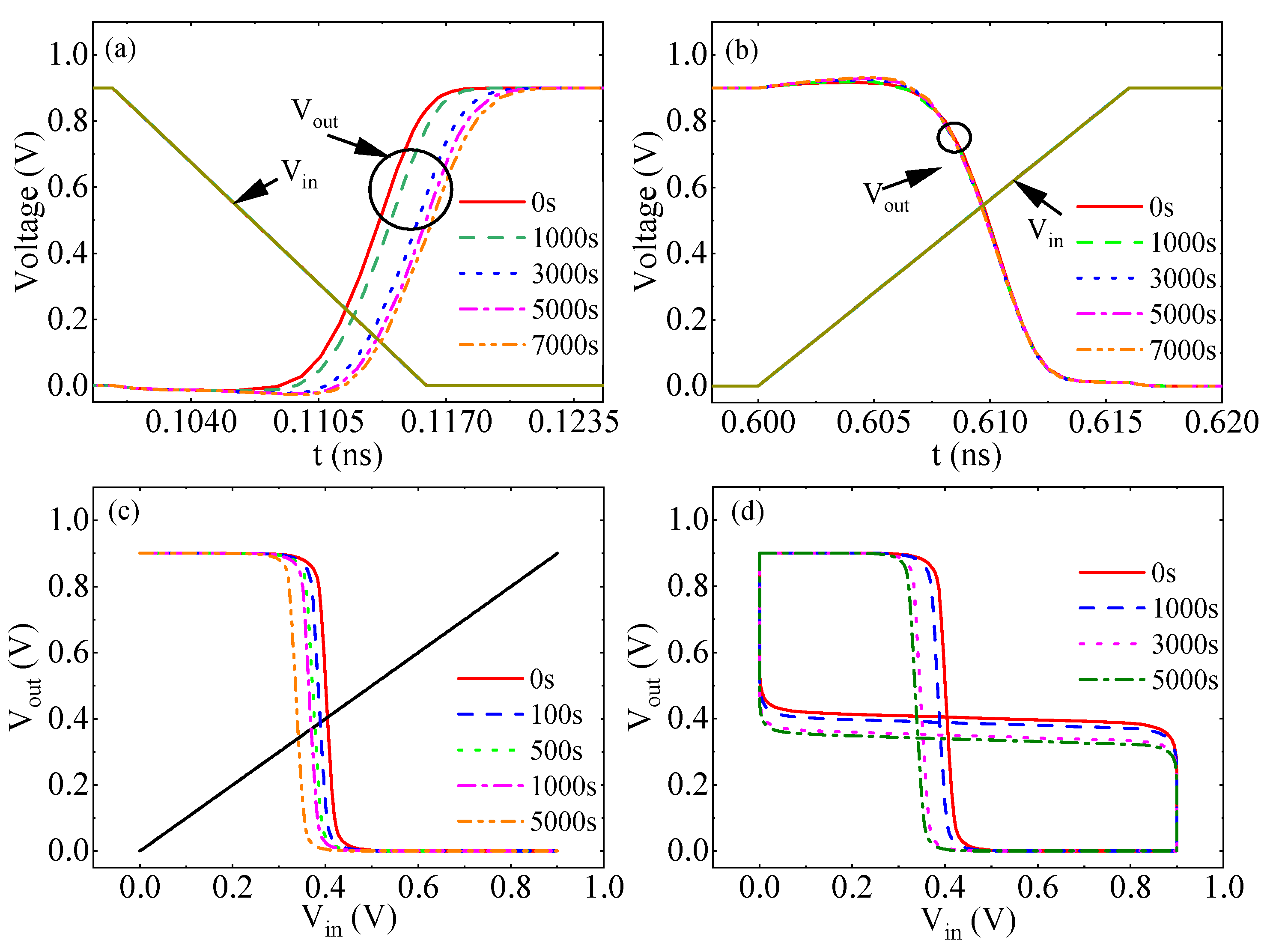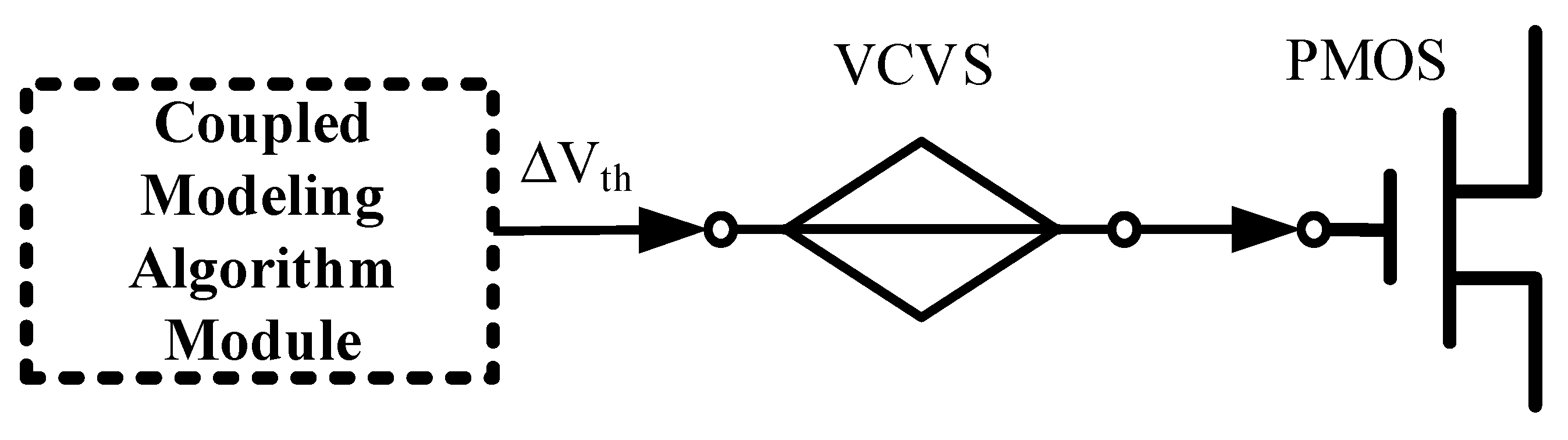 - Patra, D.; Zhang, J.; Wang, R.; Katoozi, M.; Cannon, E.H.; Huang, R.; Cao, Y. Compact modeling and simulation of accelerated circuit aging. In Proceedings of the IEEE Custom Integrated Circuits Conference (CICC), San Diego, CA, USA, 8–11 April 2018; pp. 1–4. [Google Scholar] [CrossRef]