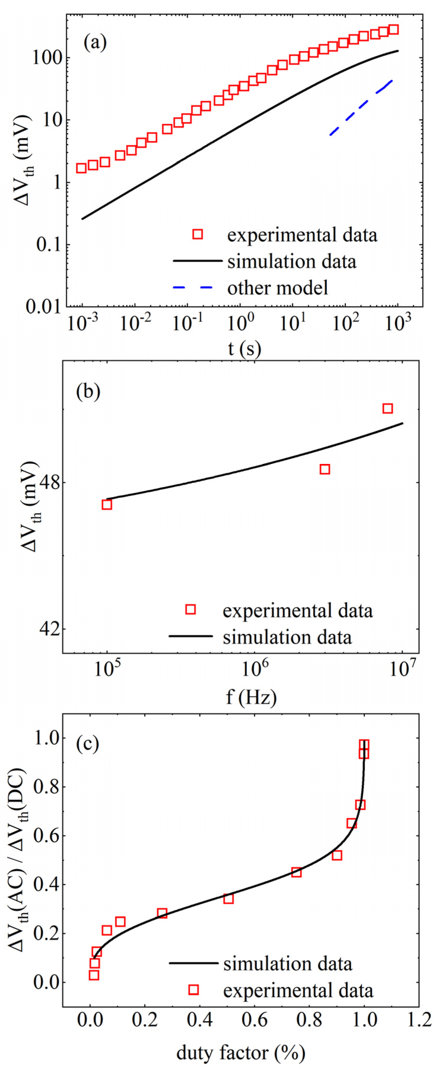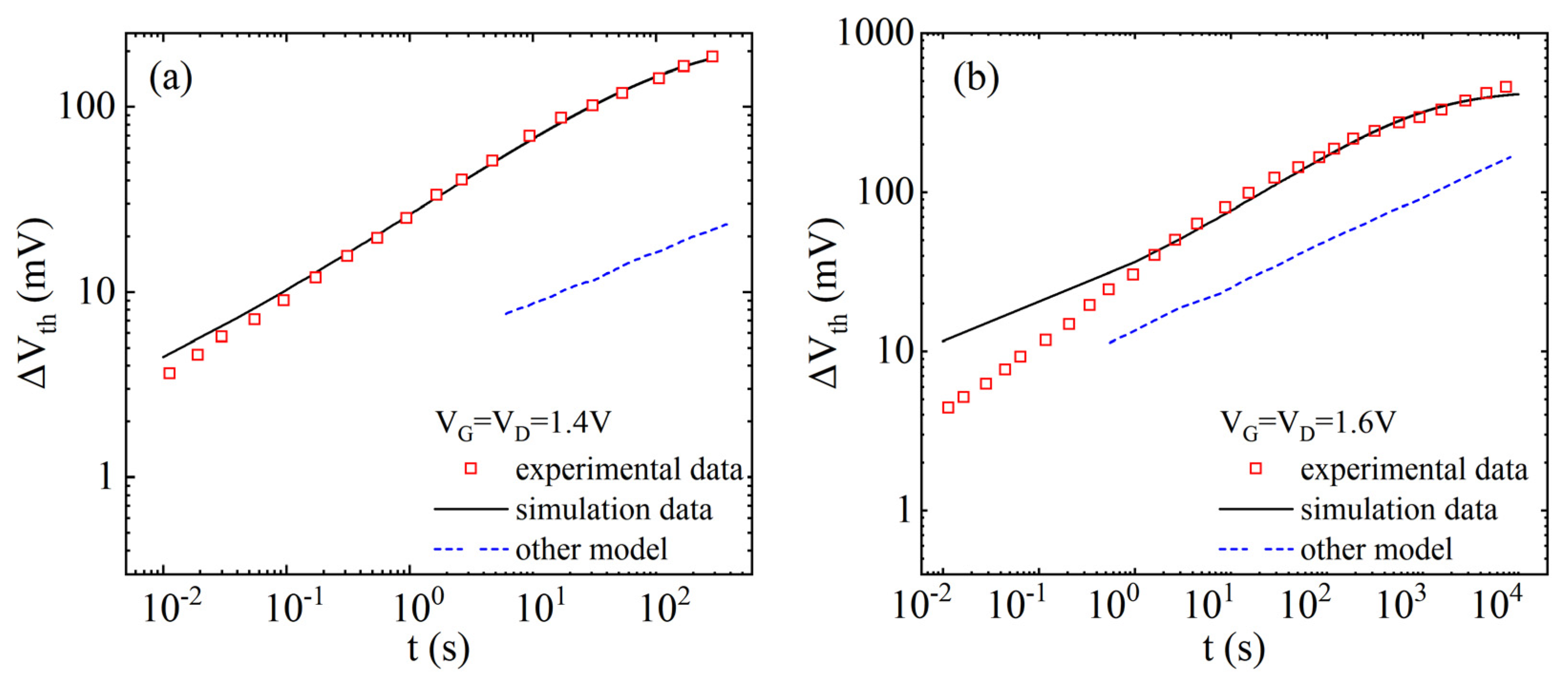 - Wang, R.; Sun, Z.; Li, Y.; Xue, Y.; Wang, Z.; Ren, P.; Ji, Z.; Zhang, L.; Huang, R. Advanced Compact Modeling for Transistor Aging: Trap-based Approaches and Mixed-mode Coupling. In Proceedings of the 2023 7th IEEE Electron Devices Technology & Manufacturing Conference (EDTM), Seoul, Republic of Korea, 7–10 March 2023; pp. 1–3. [Google Scholar] [CrossRef]