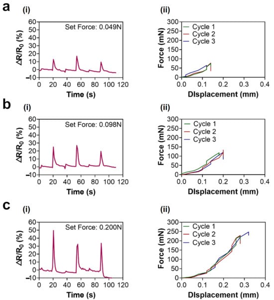 The sample containing 0.3 g MWCNTs with IPA (3.1 wt%) was selected to conduct compressive force measurement as a piezoresistive sensor because it exhibited high electrical conductivity and stable mechanical properties with respect to elongation. When the set force was 0.049 N, the electrical resistance of the sample showed an approximately 13% increase with an approximate displacement of 0.13 mm (Figure 6a(i,ii)), whereas the measured compressive force averaged 0.072 N. With a set force of 0.098 N, approximately a 24% increase in electrical resistance was recorded from the sample, with an approximate displacement of 0.19 mm (Figure 6b(i,ii)). At that time, the measured compressive force was approximately 0.124 N. A set force of 0.200 N, converted to an average measured force of 0.234 N, showed that an approximate displacement of 0.29 mm generated approximately 38% increase in electrical resistance (Figure 6c(i,ii). The difference between the set forces and the measured forces was due to a technical issue between the software and the equipment. Based on the results of compressive force measurement, the solidified conductive CNT ink for a piezoresistive sensor can detect approximately 0.050 N as the minimum force. However, if the external force increases exponentially, the CNT particles encapsulated in the piezoresistive sensor may be significantly disturbed, possibly due to a small portion of IPA remaining inside, which may affect its stability and repeatability. Therefore, the conductive CNT ink-based piezoresistive sensor is better suited for detecting small forces, specifically those less than 0.200 N. This result also implies that CNTs without functionalization can be utilized for piezoresistive sensing with additional elaborations.