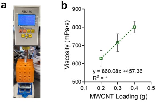 Rheological analysis. (a) Viscometer with a sample. (b) Relationship between the concentration of MWCNTs in the conductive CNT ink samples and their viscosities.