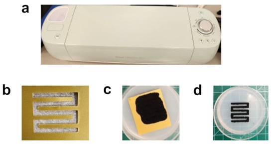 After the rheological analysis, a coating test using the conductive CNT ink was also conducted with various substrates, including cured Ecoflex, a sheet of paper, and a Petri dish, as one of the potential applications. The objective of this test was to evaluate the cohesiveness of the conductive CNT ink after its solidification onto the substrate. A machine called Cricut was used to create an interdigitated pattern using a paper mold (Figure 8a,b). After pouring the conductive CNT ink onto the paper mold, the mold was removed from the substrate (Figure 8c,d). The width of the interdigitated pattern was approximately 2 mm. Among the distinct substrates, the patterned conductive CNT ink showed the best performance on the cured Ecoflex. The sheet of paper was not suitable for the conductive CNT ink-based coating due to its liquid-absorbing properties. The coating with the Petri dish was not well realized due to the lack of adhesiveness with the conductive CNT ink. This result indicates that the conductive CNT ink is most compatible with a cured Ecoflex substrate because one of the constituent elements is the same silicone elastomer. This information would be useful for the future application of the conductive CNT ink in various patterned piezoresistive sensors based on silicone elastomers and conductive materials. It can be concluded that the conductive CNT ink has potential in several printing techniques, such as stencil printing and blade coating. Further characterizations in terms of printing accuracy and electrical resistivity could be elaborated in the continuous study.
