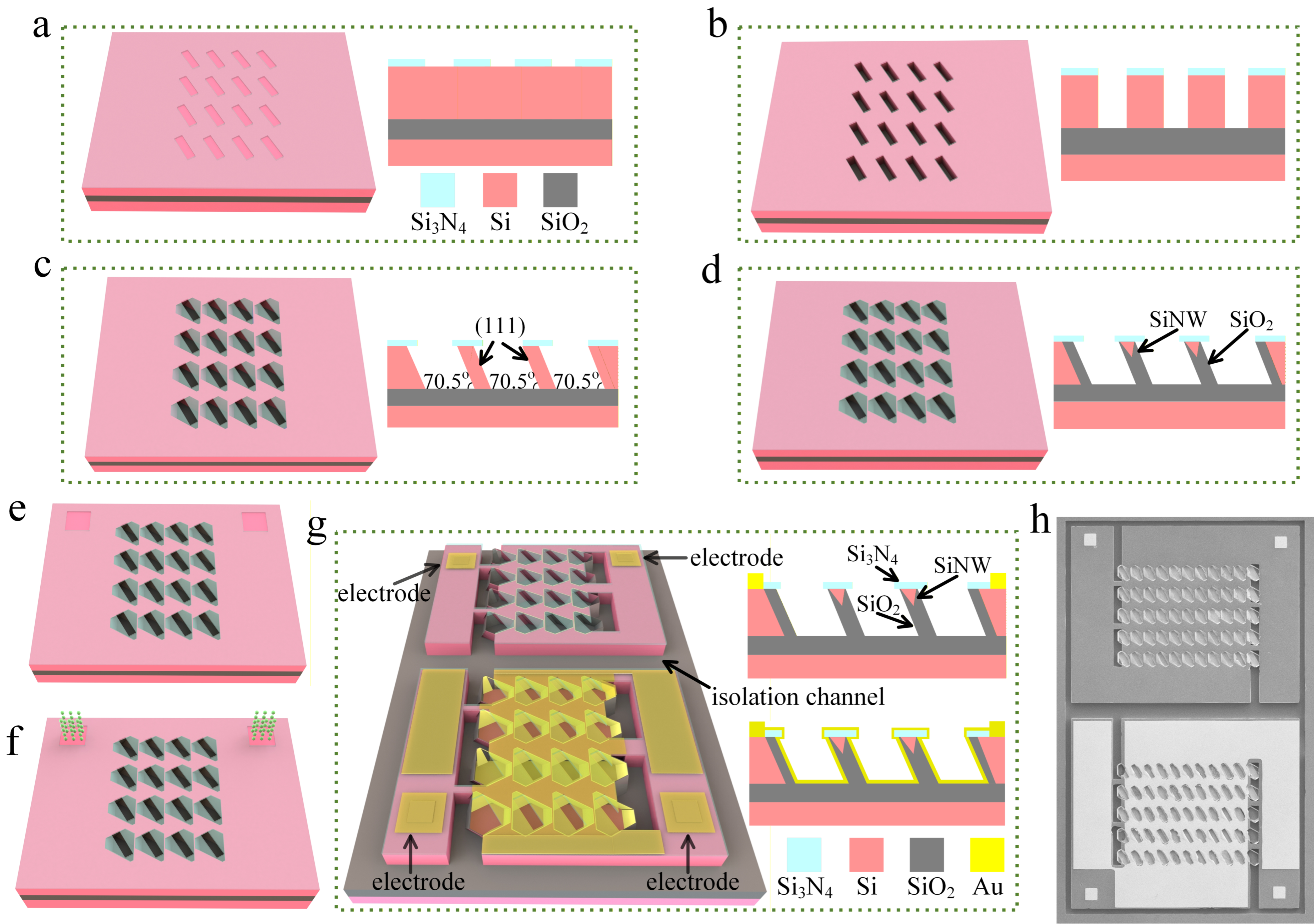 Figure 1. Fabrication sequence of SiNW array natural light detector. (a) Reactive ion etching of Si3N4 mask to define adjacent rectangular windows (cross-section shown at right); (b) Deep reactive-ion etching to extend the trenches to buried oxide layer; (c) Anisotropic wet etching in KOH solution transforming the trenches into hexagonal grooves, forming thin silicon walls bounded by (111)-oriented sidewalls; (d) Self-limiting oxidation forming SiNWs with triangular cross-sections at wall apex; (e) Reactive ion etching of silicon nitride in specific locations; (f) Boron ion implantation; (g) The fabrication of electrodes and isolation channels; (h) Scanning electron microscopy (SEM) image of SiNW array photodetector.