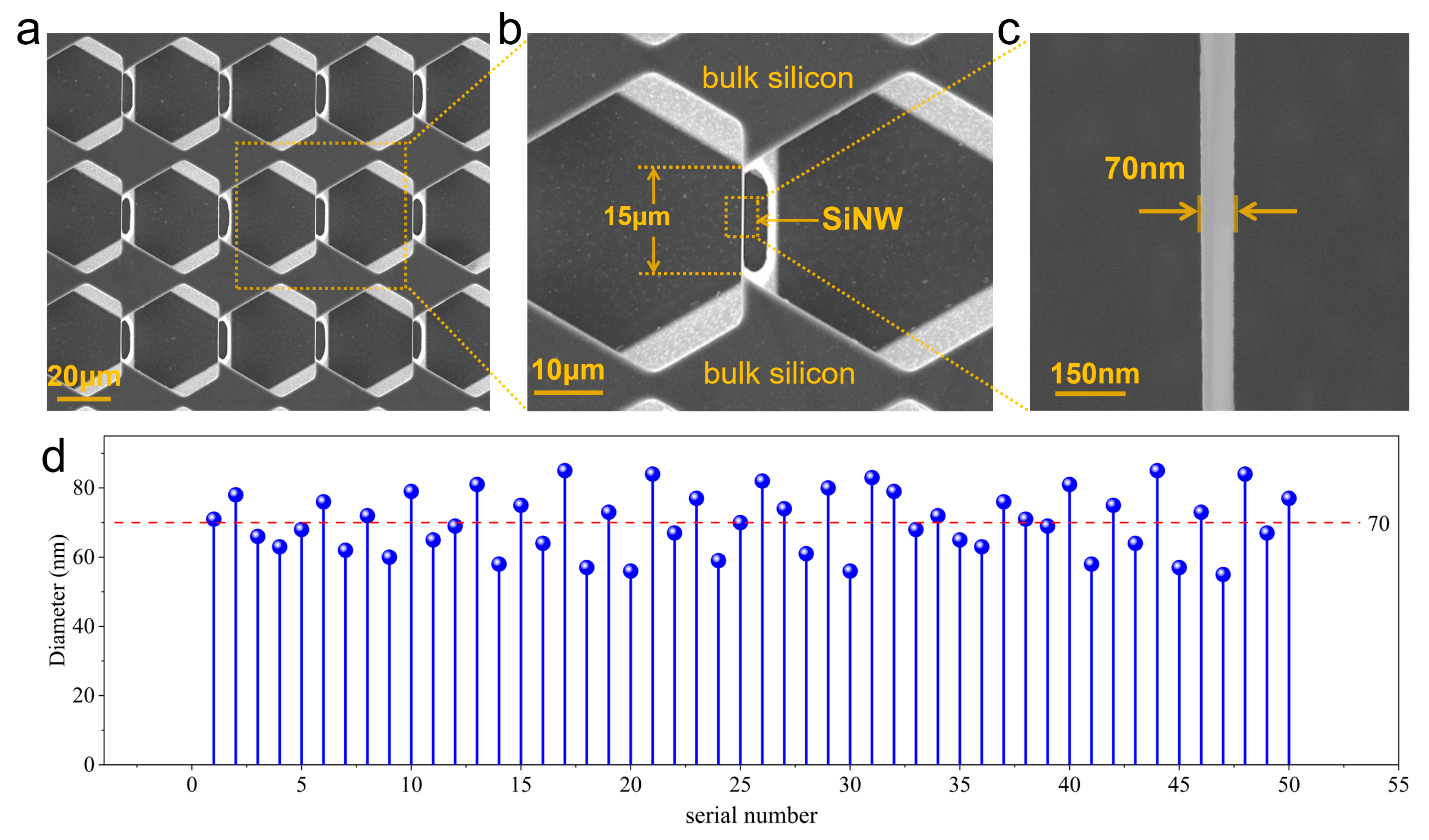Figure 2 presents scanning electron microscopy (SEM) images of the SiNW array. To obtain a fully suspended SiNW array, the Si3N4 and SiO2 films were removed. The ends of the SiNWs are monolithically integrated with the bulk silicon substrate, enabling reliable electrical connection without requiring complex transfer steps. Furthermore, this approach allows for the highly controllable fabrication of SiNWs with tunable lengths and diameters. As shown in Figure 2d, the SiNW diameters are centered at approximately 70 nm. In summary, through this streamlined process, we have achieved high controllability, miniaturization, and cost-effective fabrication of SiNW array devices.