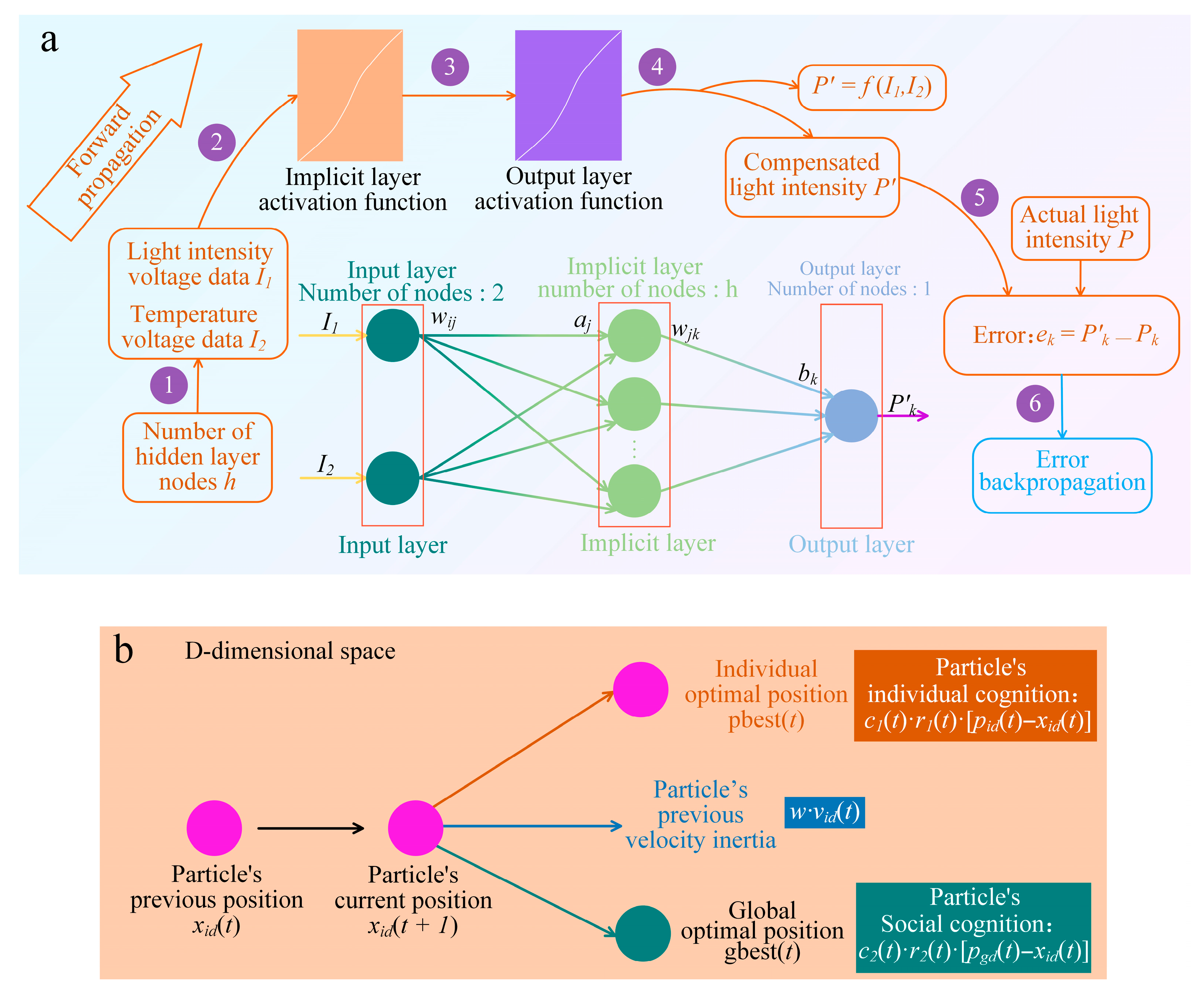 Figure 3. (a) Topology of the BP neural network for temperature compensation; (b) schematic of the particle velocity and position update mechanism in the PSO algorithm.