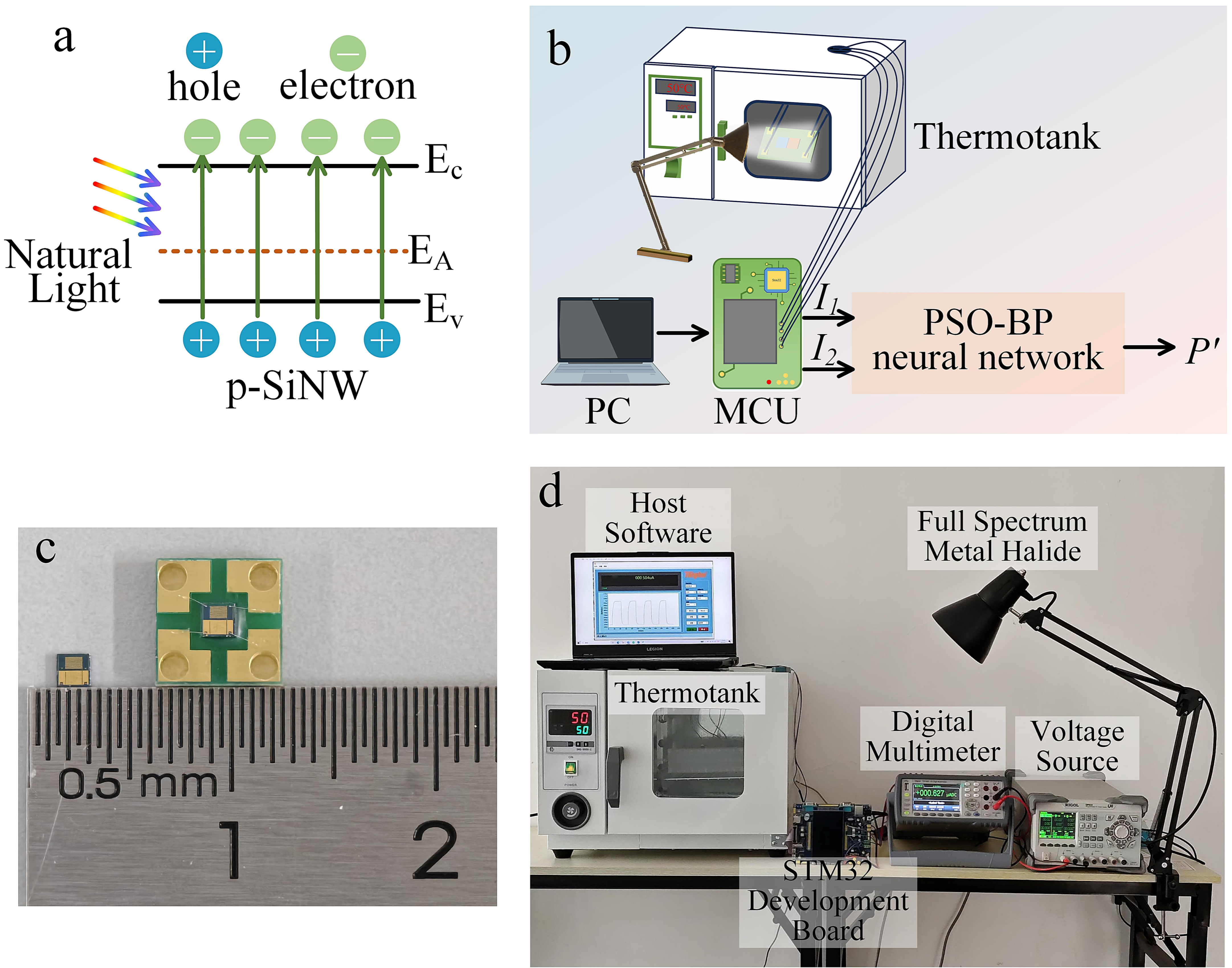 Figure 4c displays the photographs of the fabricated SiNW photodetector chip and its encapsulated device, while Figure 4d depicts the experimental setup employed for temperature compensation. As shown in Figure 4d, the device is powered by a RIGOL DP832 DC power supply, with electrical signals acquired by a Tonghui TH1963 digital multimeter. Data are transmitted in real-time and stored on a computer for analysis. Additionally, a full-spectrum metal halide lamp provides illumination, a thermotank regulates the ambient temperature, and an STM32 microcontroller collects the output voltage signal. The sensing mechanism is based on the photoconductive effect. Under illumination, the photoresponse arises primarily from intrinsic absorption where valence band electrons are excited to the conduction band. Simultaneously, the high surface-to-volume ratio of SiNWs introduces a high density of localized surface states [29]. These states capture photogenerated carriers, inhibiting immediate recombination and prolonging the carrier lifetime, thereby modulating the channel conductivity. In practical operation, both light intensity and ambient temperature simultaneously affect the detector’s response, introducing thermal interference into the output signal. To obtain accurate light intensity, a temperature compensation strategy is implemented. The voltage signals corresponding to light intensity (I1) and temperature (I2), acquired by a microcontroller, serve as inputs to the neural network. The network processes these inputs to generate a compensated light intensity (P’), which approximates the standard light intensity (P) by minimizing temperature-induced errors.