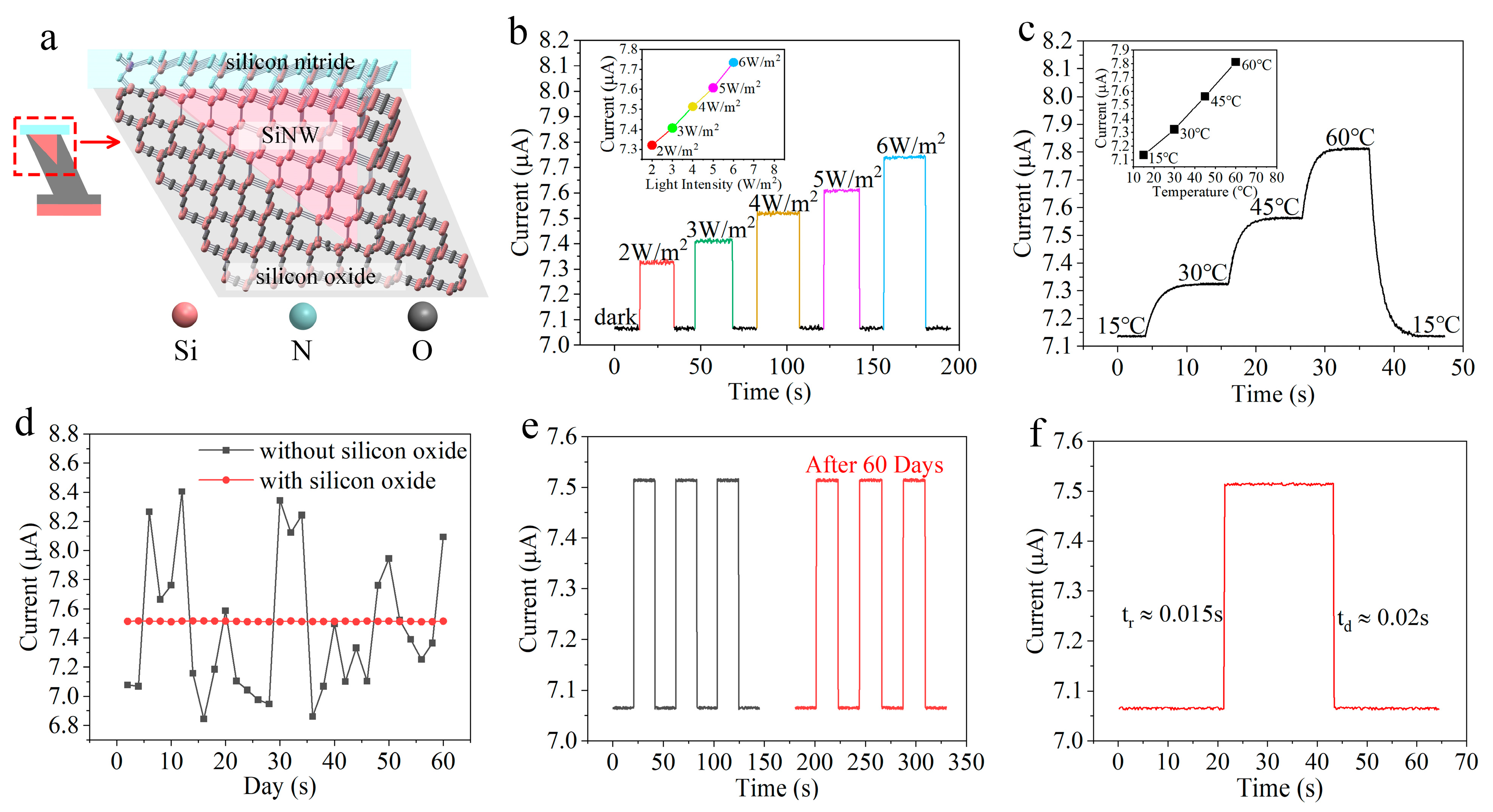 Figure 5. (a) Schematic of the passivated SiNWs structure; (b) time-dependent photo-response of the detector; (c) current variation trends of the SiNW temperature sensing array within the temperature range of 15–60 °C; (d) comparison of long-term stability between the encapsulated and bare detectors; (e) comparison of current measurement results before and after a 60-day storage period; (f) magnified view of the photocurrent signal.