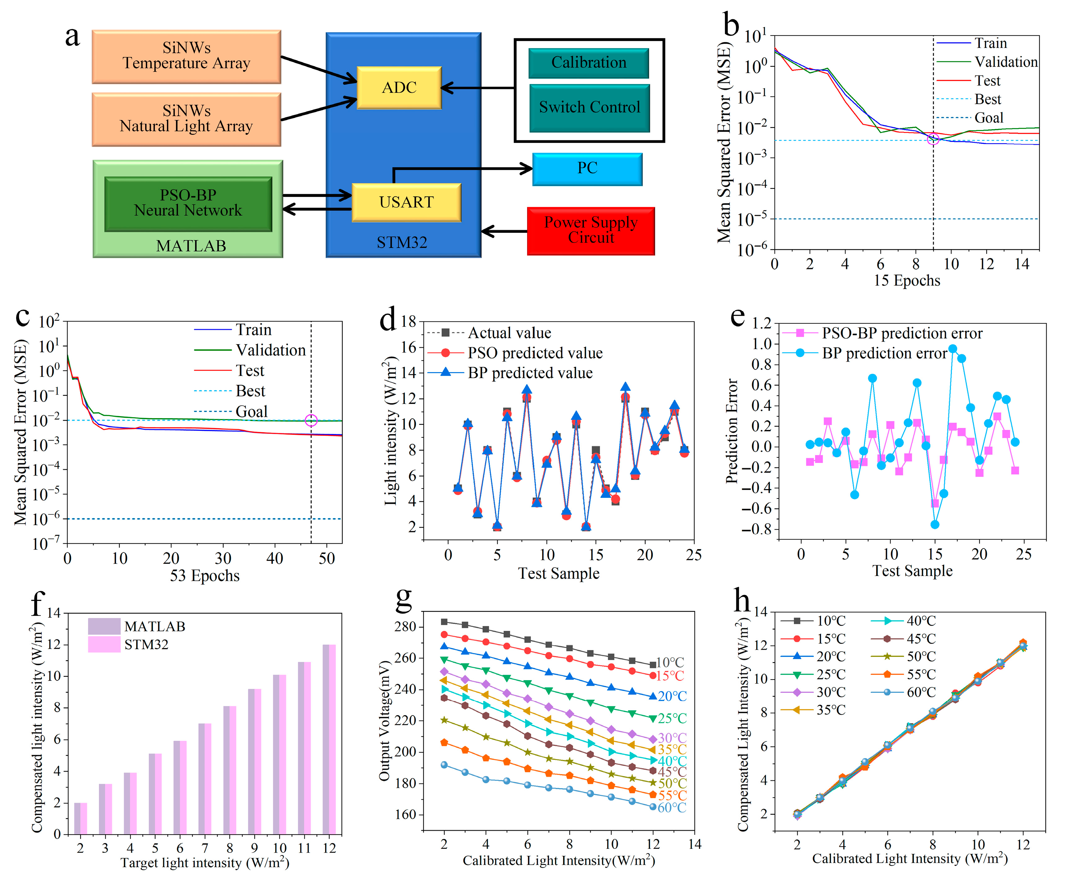 Figure 6. (a) Schematic of the temperature compensation experimental setup; (b) training performance curves of the PSO-BP neural network; (c) training performance curves of the traditional BP neural network; (d) comparison of prediction results on the test set between the traditional BP and PSO-BP models; (e) comparison of relative errors of the two models; (f) comparison of compensation results between MATLAB simulation and STM32 hardware implementation under varying optical power densities at 30 °C; (g) temperature-dependent response characteristics of the SiNW array photodetector; (h) compensated optical power density outputs processed by the PSO-BP neural network.