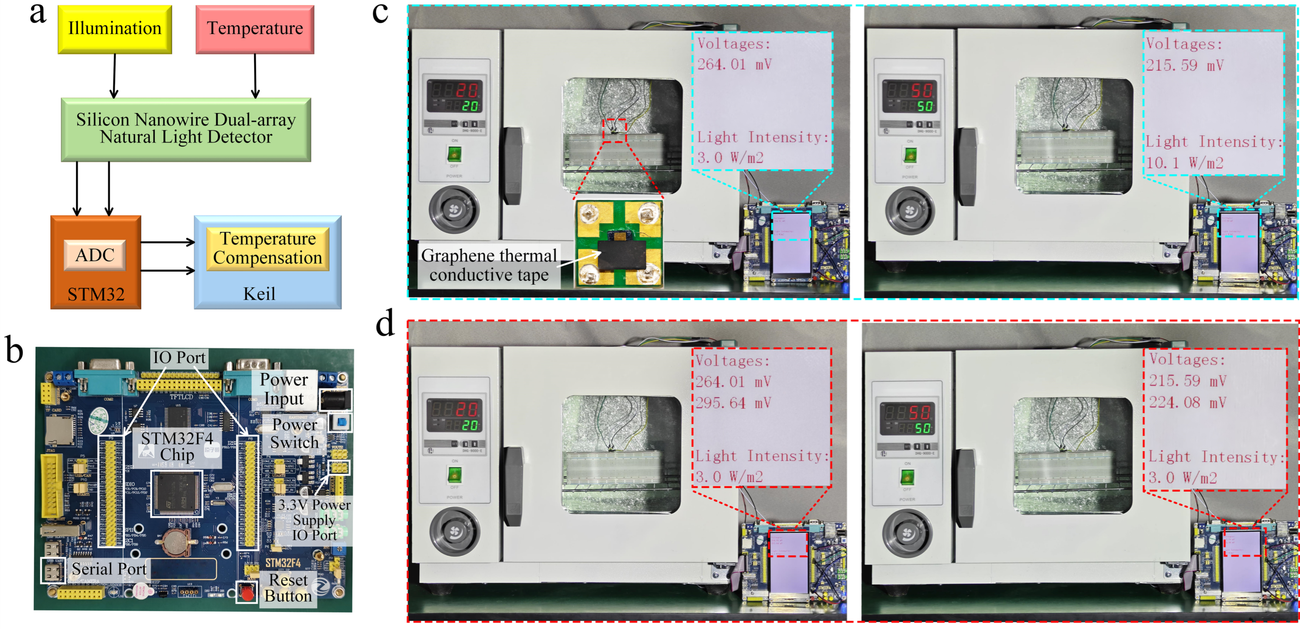 Upon the deployment of the neural network model on the STM32F4 microcontroller, experimental validation of temperature compensation for the SiNW array photodetector was performed. Figure 7a depicts the flowchart of the STM32F4-based temperature compensation procedure, while Figure 7b displays the photograph of the STM32F4 development board. The system is based on a dual-array SiNW photodetector, which simultaneously captures optical and temperature signals, converting them into analog voltage signals. Following acquisition via the integrated ADC of the STM32, the dual-channel data are processed by the embedded PSO-BP algorithm, thereby enabling real-time temperature compensation of the optical signal. To validate the compensation efficacy, the device was subjected to an optical power density of 3 W/m2 under two distinct thermal environments: 20 °C and 50 °C. To mitigate optical interference on the temperature array, opaque graphene tape was employed to optically isolate the sensing area prior to testing, ensuring measurement accuracy. Figure 7c shows the output characteristics prior to compensation. Although the optical power density was maintained at 3 W/m2, the coupling of thermal interference into the output signal resulted in significant deviations in measured values. Figure 7d displays the results obtained after applying temperature compensation. The compensation algorithm effectively mitigated thermal effects, resulting in highly accurate optical power density measurements.