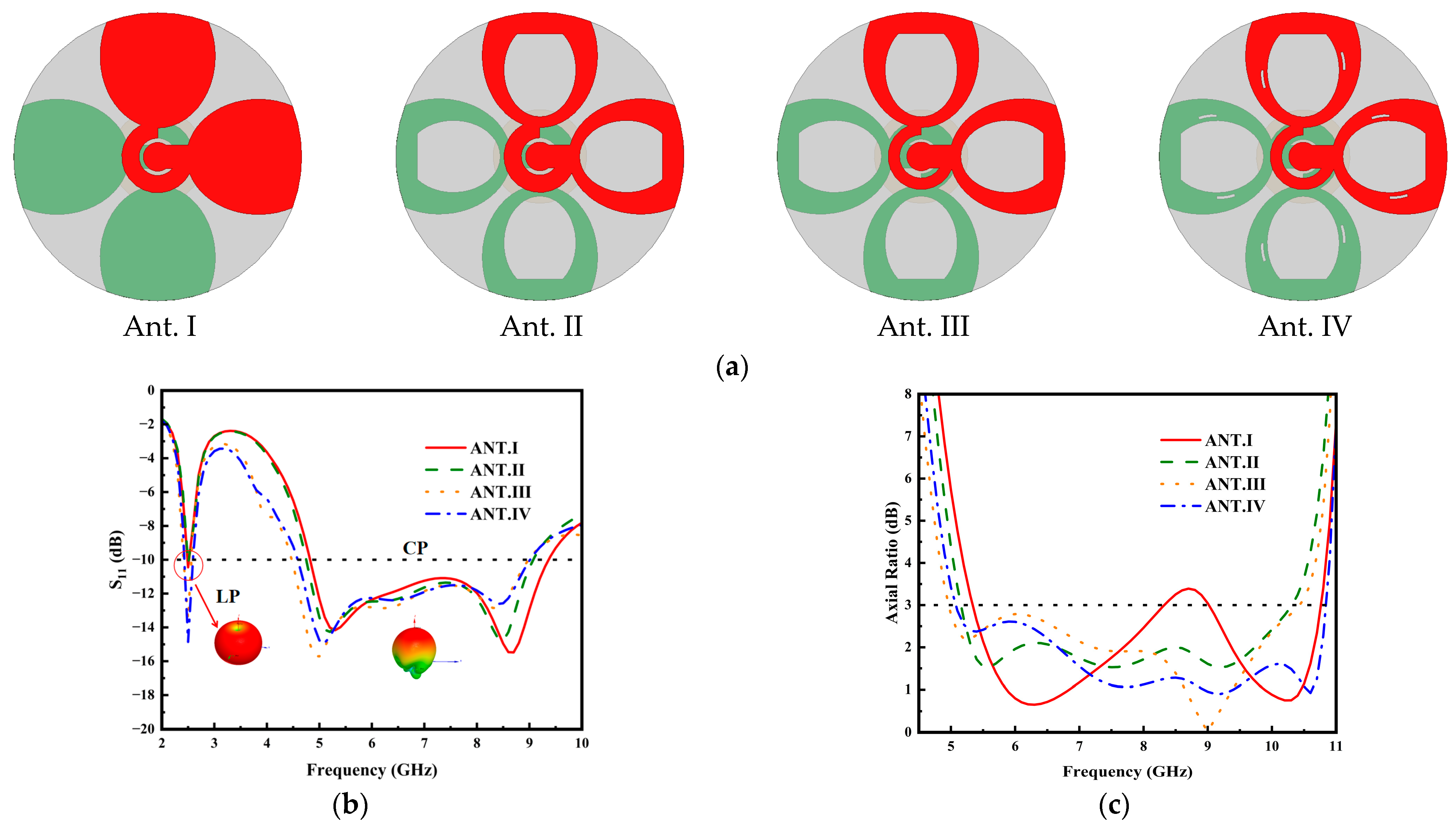 11| < −10 dB) and AR (AR < 3 dB) bandwidth is 4.70–9.20 GHz and 5.10–11.05 GHz but exhibits poor matching at 2.45 GHz. Subsequently, the width of the top phase-shifting ring is reduced to create Antenna III (Ant. III). This asymmetry in ring widths reduces the reactance near 2.45 GHz, successfully yielding a well-matched lower band (2.41–2.57 GHz) while also enhancing the upper-band matching. In the final design (Ant. IV), curved slots are introduced at various positions of the radiating patch. These slots create additional surface current paths that compensate for the phase delay of the fixed-length phase-shifting line, resulting in a significant enhancement of polarization purity within the operational band.