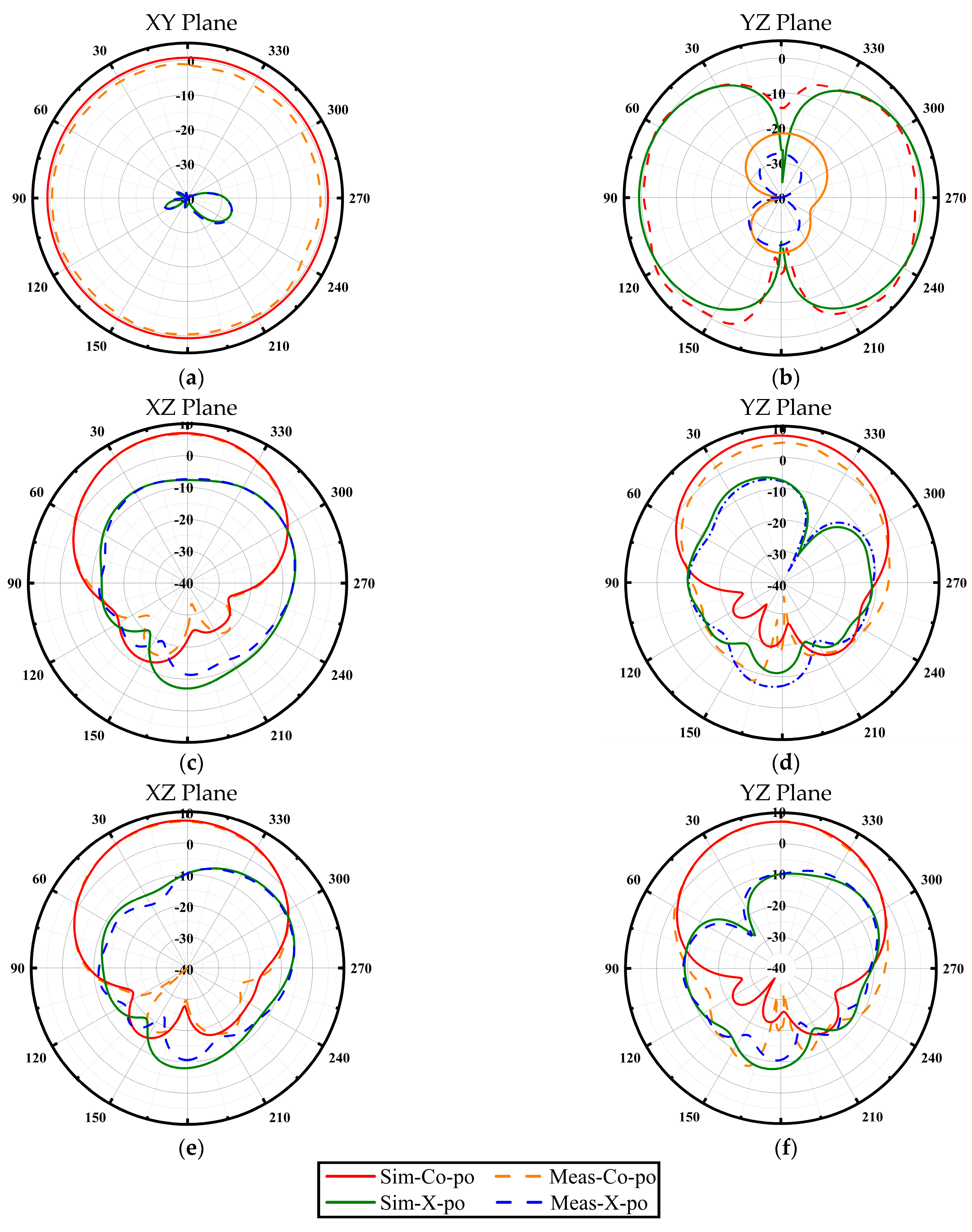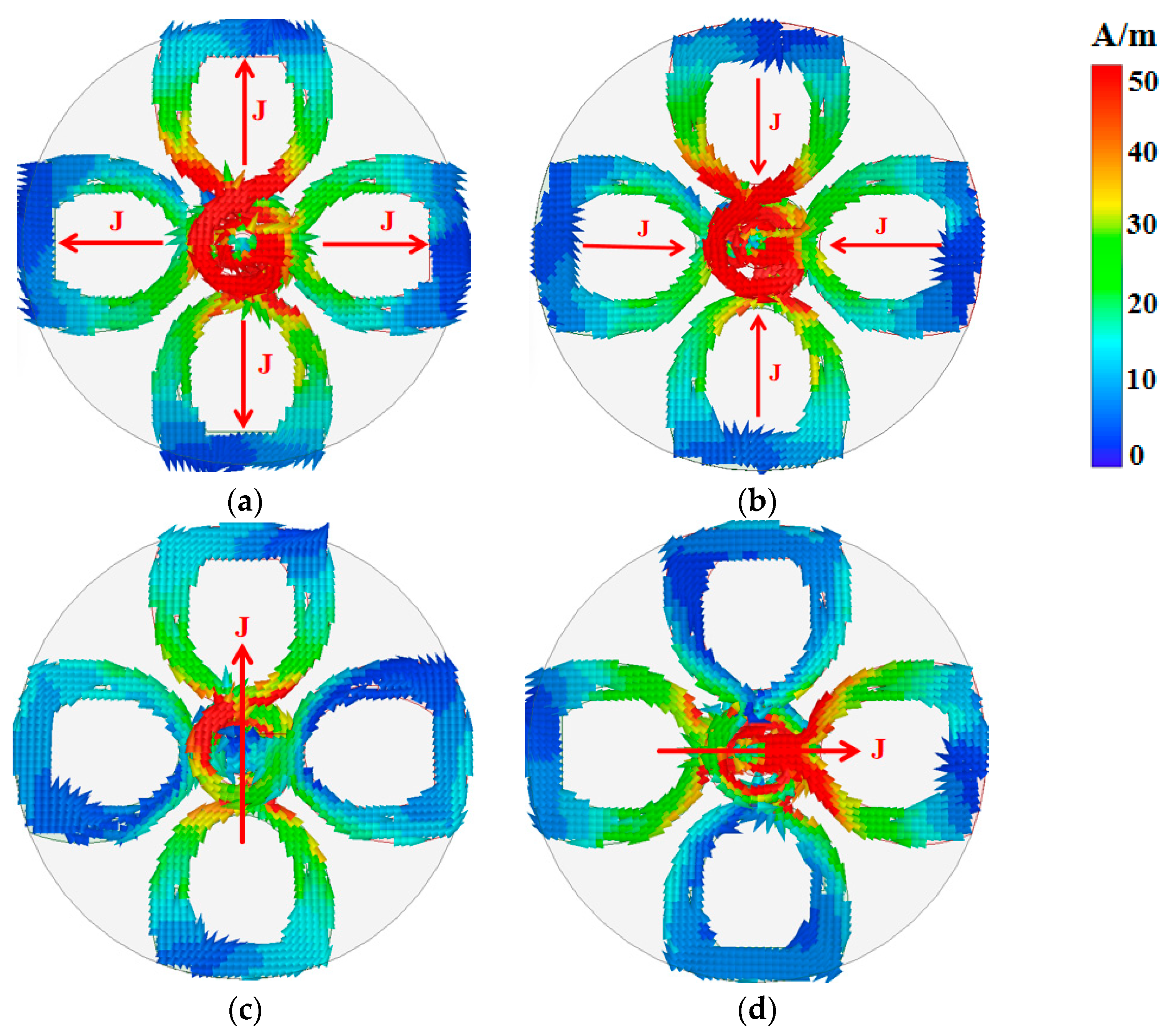 Figure 3c,d), the operation shifts to a crossed-dipole mode. The current magnitude peaks at the centers of the dipoles (i.e., the feed points) and diminishes toward their extremities. A distinct counterclockwise rotation of the current vector along the axis (marked by red arrows) confirms the generation of right-hand circularly polarized (RHCP) radiation. This is quantitatively demonstrated by the radiation pattern, presented in