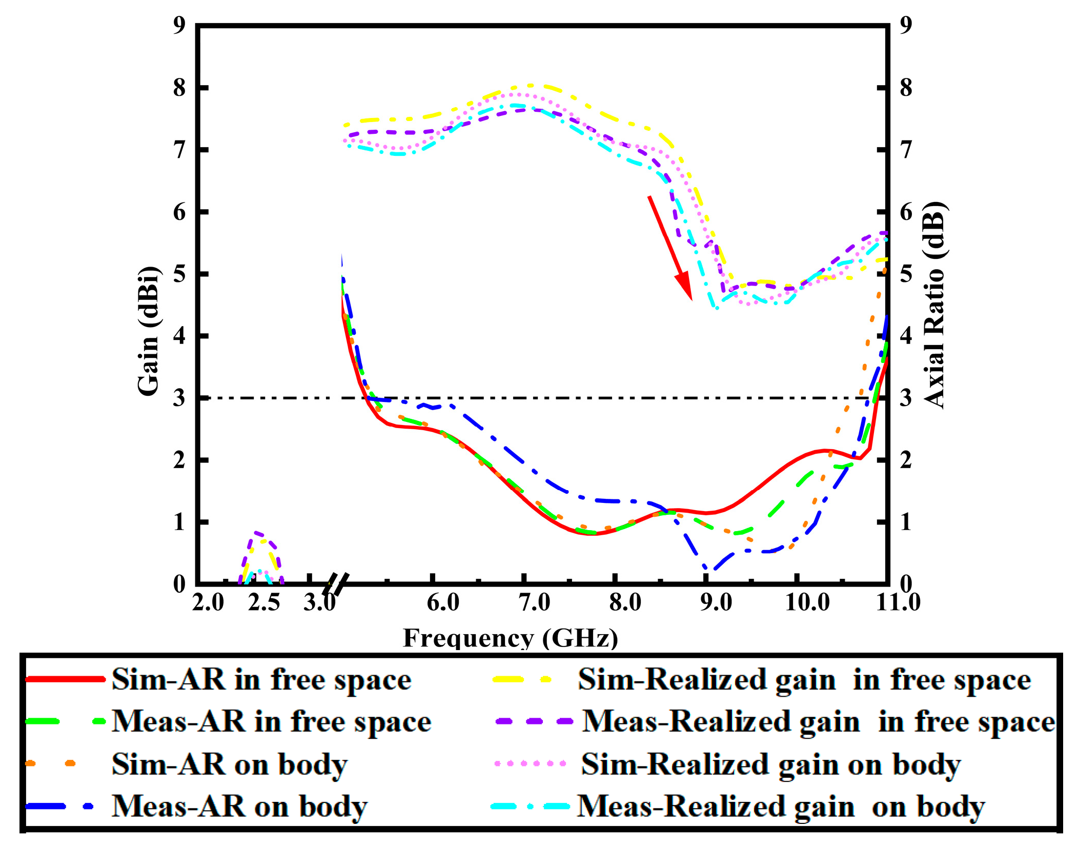 Figure 7 presents the simulated and measured AR and realized gain of the proposed antenna in both free space and on-body scenarios. It can be observed that the gain and AR performance across the entire AR bandwidth show minimal variation under the two tested environments. A key observation is the rapid decline in gain within the upper CP band (highlighted by red arrows), particularly around 9.0 GHz. The reason lies in the design of the coaxially fed antenna, whose height above the textile ground plane is set to approximately a quarter-wavelength in free space at 5.8 GHz. This spacing allows the ground plane to effectively reflect backward cross-polarized radiation. As the frequency increases, the required quarter-wavelength shortens correspondingly. Beyond approximately 8.5 GHz, this fixed height becomes insufficient for sustaining effective boresight reflection, resulting in a sharp gain drop in the upper frequency band. In the lower band, the on-body measured gain is only 0.3 dBi, a reduction attributable to the proximity of the human body. Measurement results show that the 3 dB AR bandwidth within the operational band ranges from 5.2 GHz to 9.57 GHz in free space, and from 5.3 GHz to 9.57 GHz in on-body conditions. Minor discrepancies between simulation and measurement are consistent with the idealized nature of the simulation model and the practical tolerances of manual fabrication.