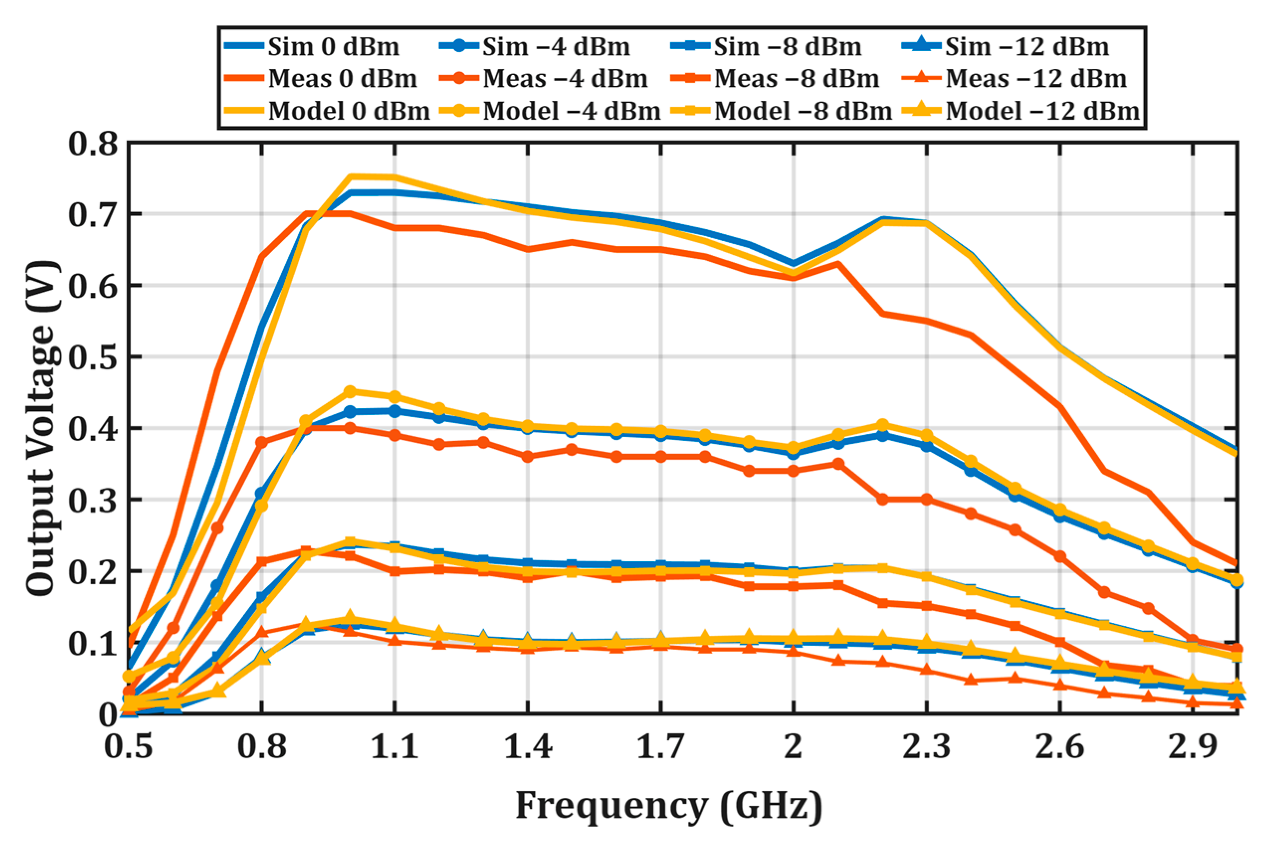 out) responses obtained from the proposed model, simulations, and experimental measurements in the investigated frequency range. Since the regression coefficients used in the proposed model are derived from data obtained in the simulation environment, the model exhibits almost complete agreement with the simulation results for all investigated input power levels (0, −4, −8, and −12 dBm). Nevertheless, the model closely follows the experimental measurement data and successfully captures the general frequency-dependent behavior of the rectifier. The strong similarity between the output voltage profiles predicted by the model and the measured values in the same frequency ranges confirms the robustness and practical validity of the proposed modeling approach.