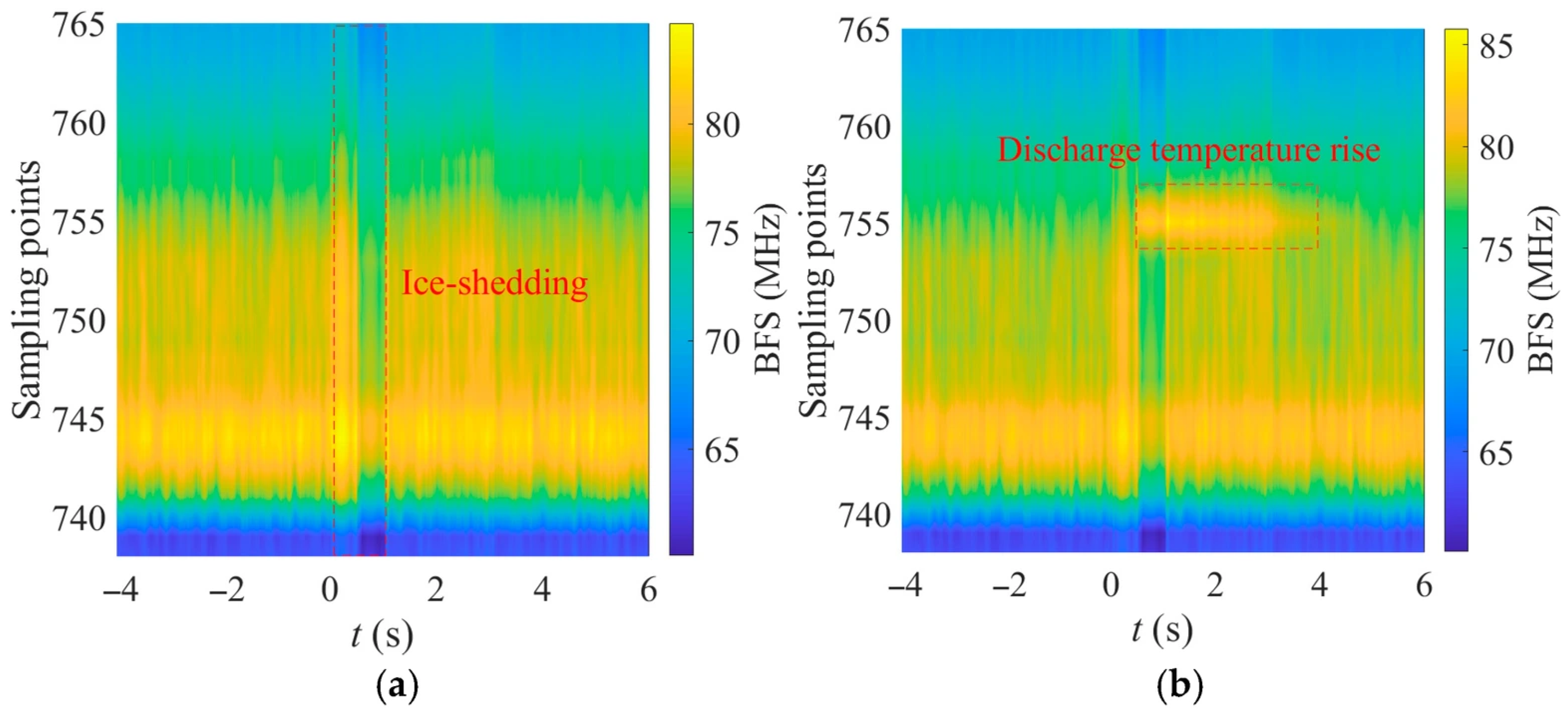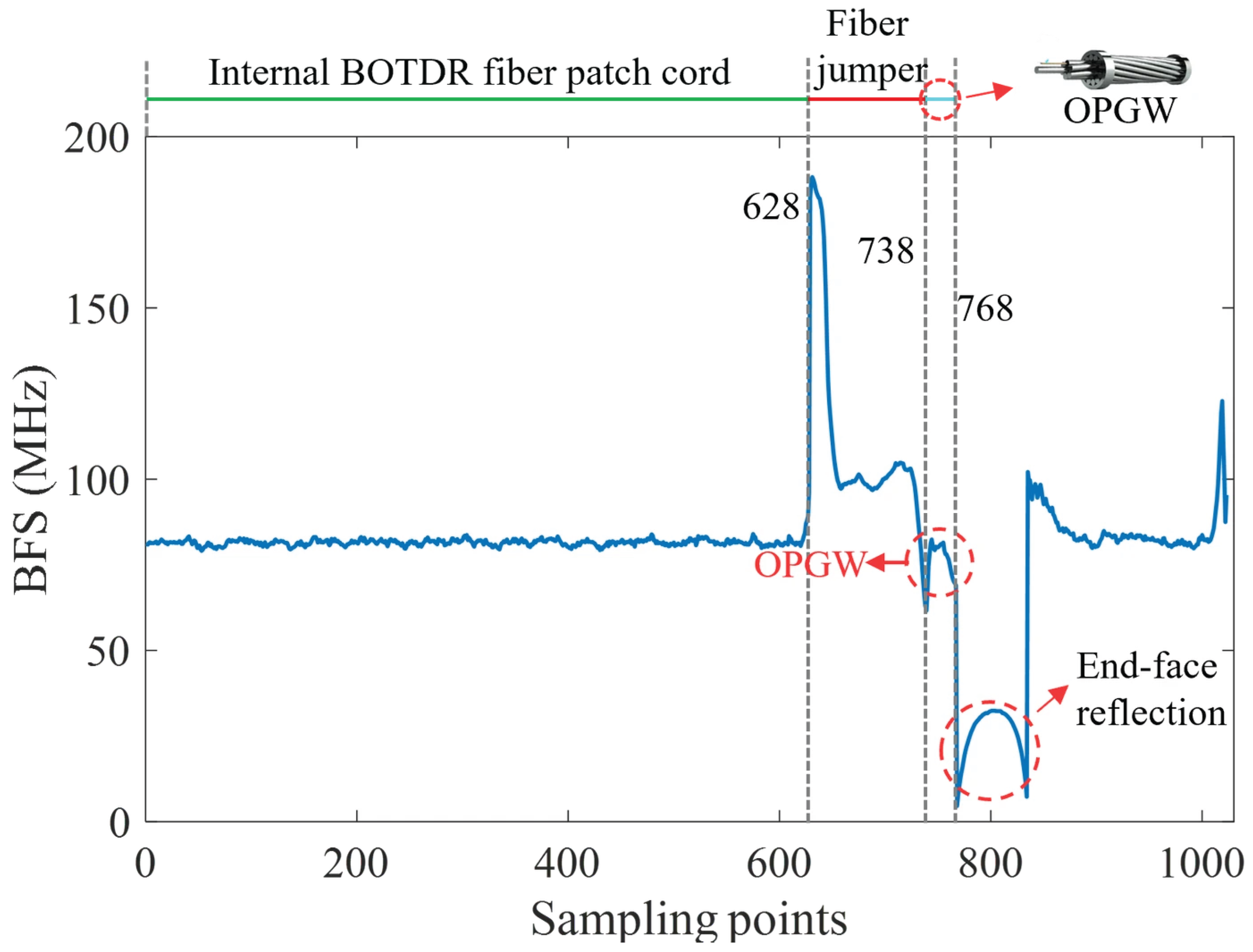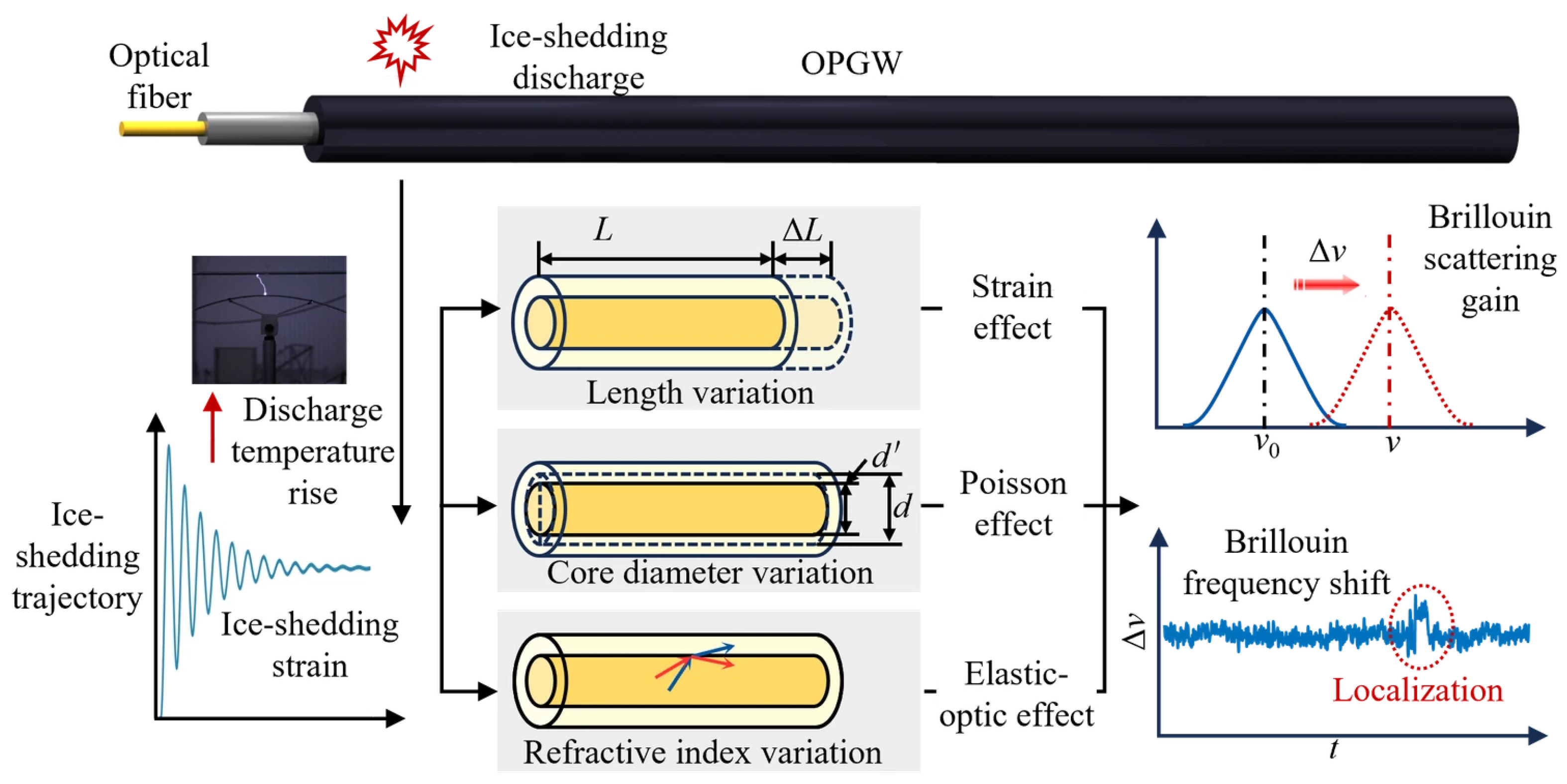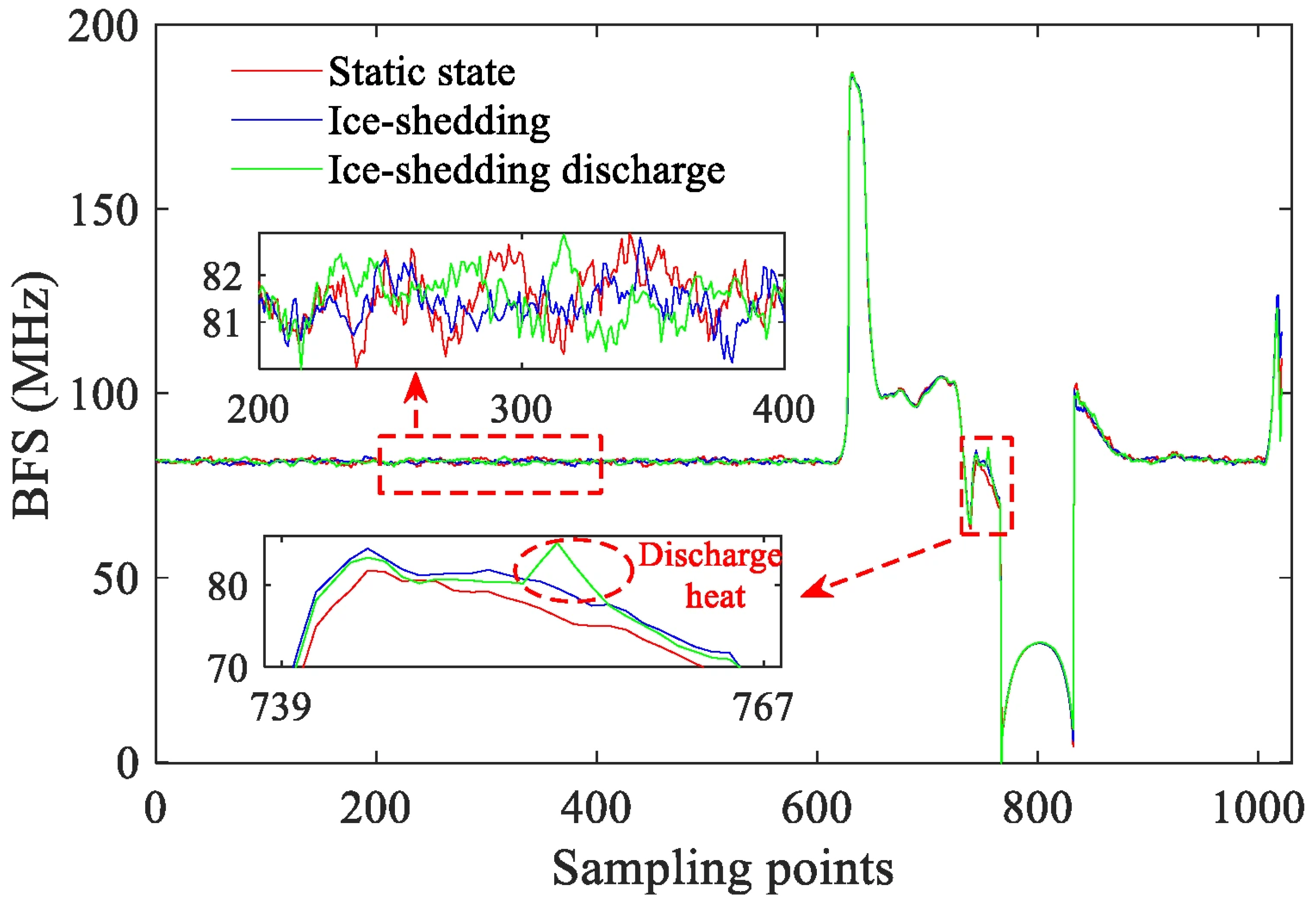 - Ice-shedding strain: Axial stress variations induced by the jump propagate through the aluminum-clad steel strands and the metal tube, eventually reaching the encapsulated fiber. The fiber is subjected to rapid dynamic tensile strain, causing changes in the BFS.