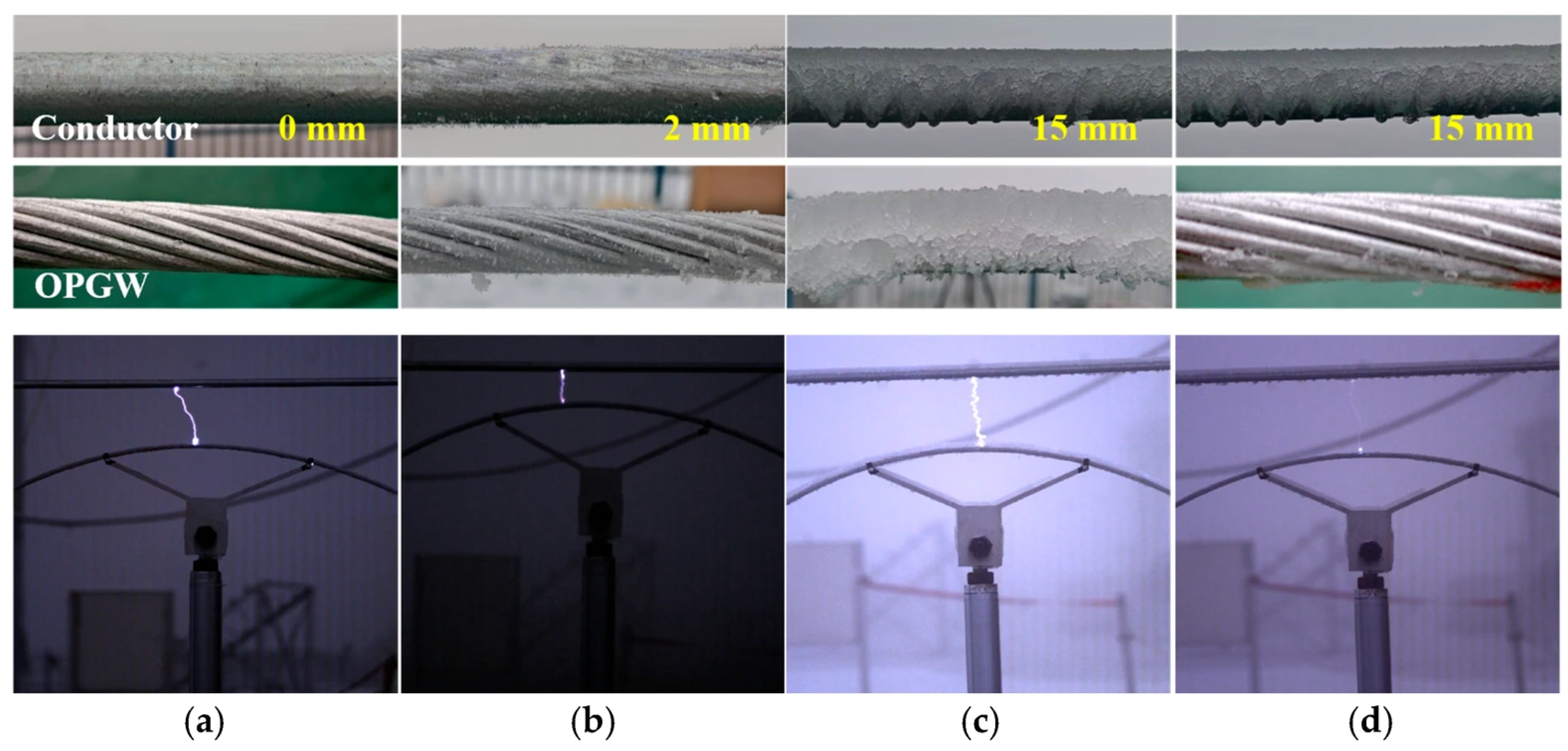 - Wu, Z.; Hao, Y.; Zheng, Y.; Huang, L.; Pu, Z.; Huang, H. Effects of ice coating on the maximum discharge distance during ice-shedding of conductor–ground wire in 110 kV transmission lines. In Proceedings of the 2025 8th International Conference on Energy, Electrical and Power Engineering (CEEPE), Wuxi, China, 17–20 June 2025; IEEE: New York, NY, USA, 2025; pp. 281–284. [Google Scholar]