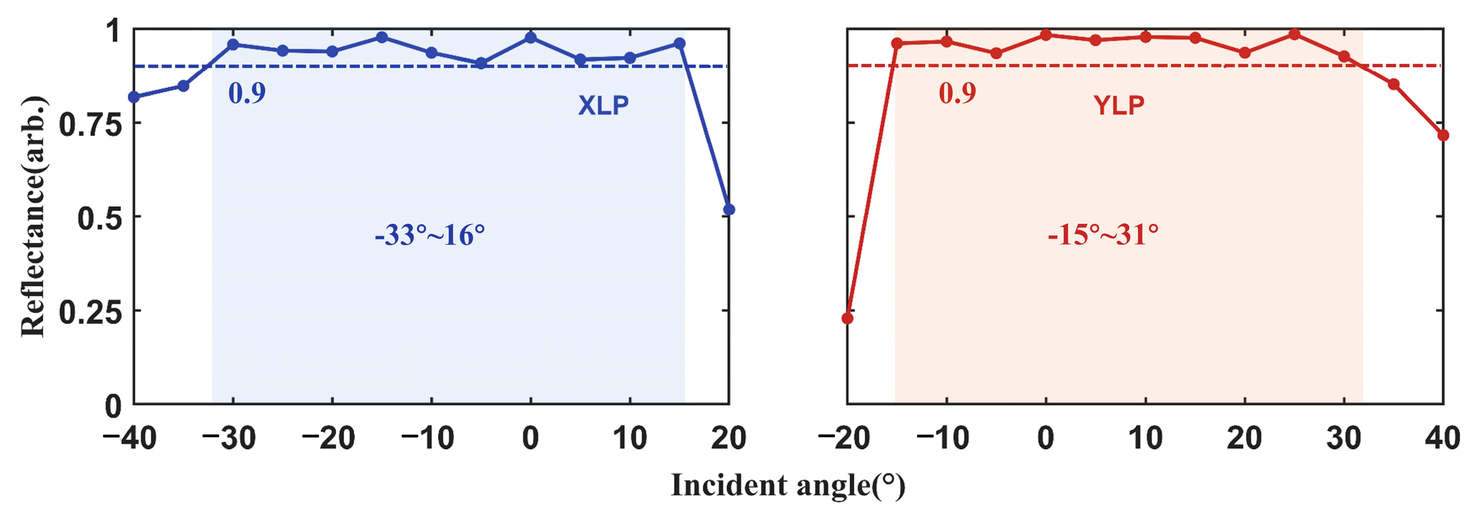 Figure 5. The incident angle ranges were set from −40° to 20° for XLP and from −20° to 40° for YLP. For XLP, the reflectivity remains above 90% for incident angles between −33° and 16°. For YLP, reflectivity above 90% is maintained for incident angles between −15° and 31°.