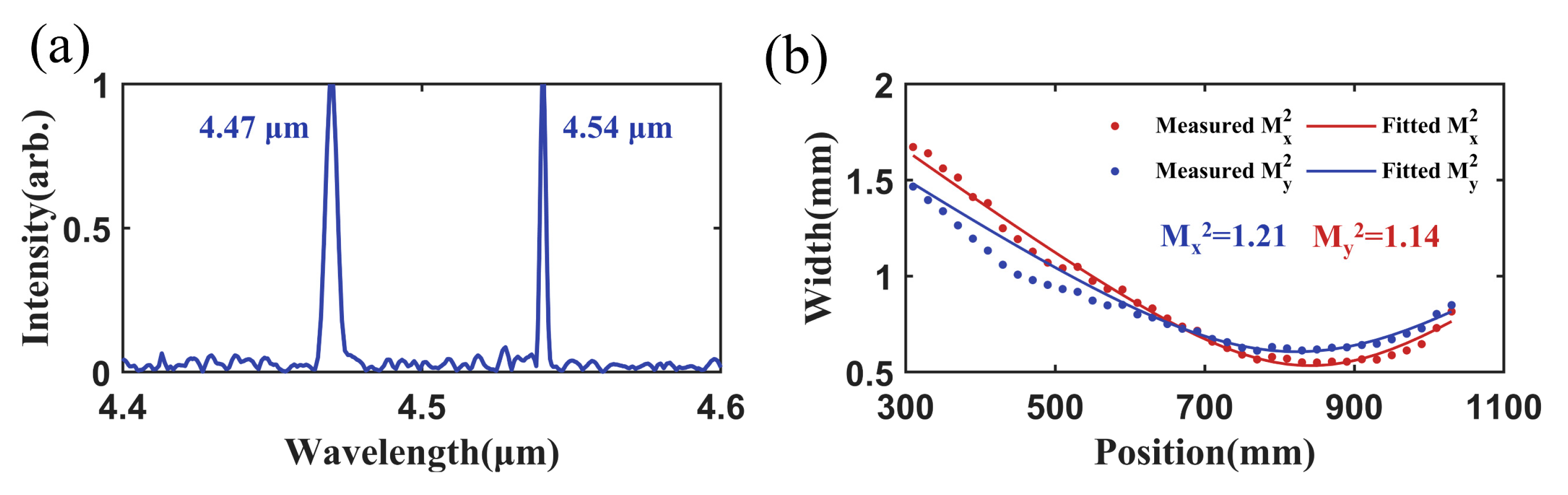 Figure 9a. The spectrum contained two distinct wavelength peaks located at 4.47 μm and 4.54 μm. Compared to the spectra of the QCLs, neither the central wavelength nor the spectral width shows significant changes, indicating that the metasurface combiner did not alter the spectral profile. When the output powers of both QCLs were 50 mW, the power of the combined beam was 88.9 mW, corresponding to a polarization combining efficiency of 88.9%. The