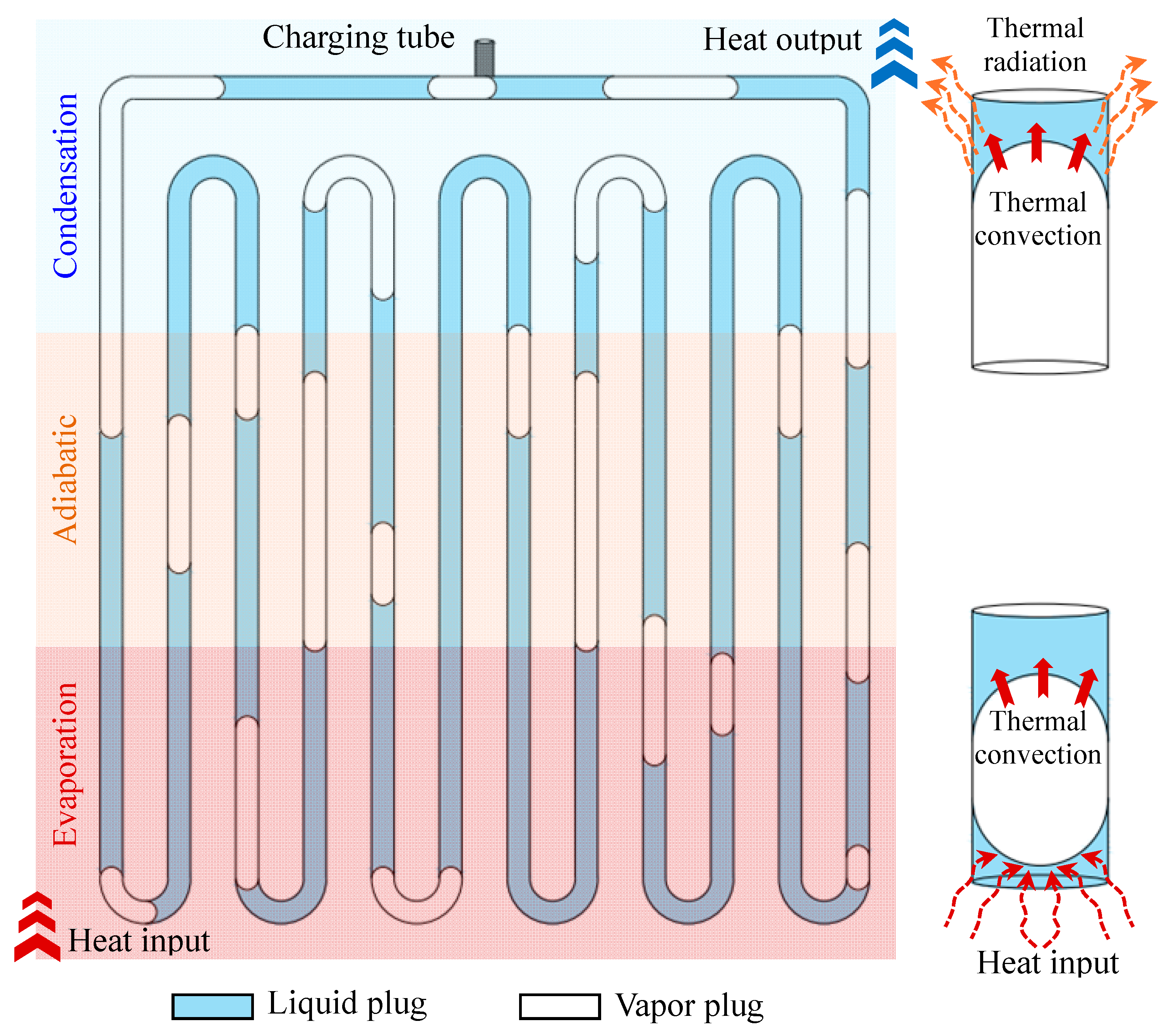 A number of dynamically connected processes, such as bubble nucleation, expansion, coalescence, contraction, rupture, and the evaporation and condensation of liquid layers, are involved in the working concept of the MPHP. Based on their operational characteristics, the MPHP’s tube segments are separated into evaporation, adiabatic, and condensation sections, as illustrated in Figure 2. Initially, surface tension greatly affects the working fluid inside the pipe [15], which is limited by its small dimensions. This results in the formation of randomly distributed gas and liquid plugs. The working fluid absorbs heat in the evaporation section during operation, changing its phase and creating bubbles. The working fluid is propelled into the condensation section by the abrupt local pressure rise caused by these rapidly expanding bubbles. When the condensing portion cools, the bubble/gas plug compresses and bursts, lowering pressure and creating working fluid reflux. Heat transfer from the evaporation section to the condensation section is made possible by the refrigerant’s periodic oscillatory motion within the MPHP, which is driven by pressure differentials between tube sections and pressure imbalances between neighboring tubes [16].