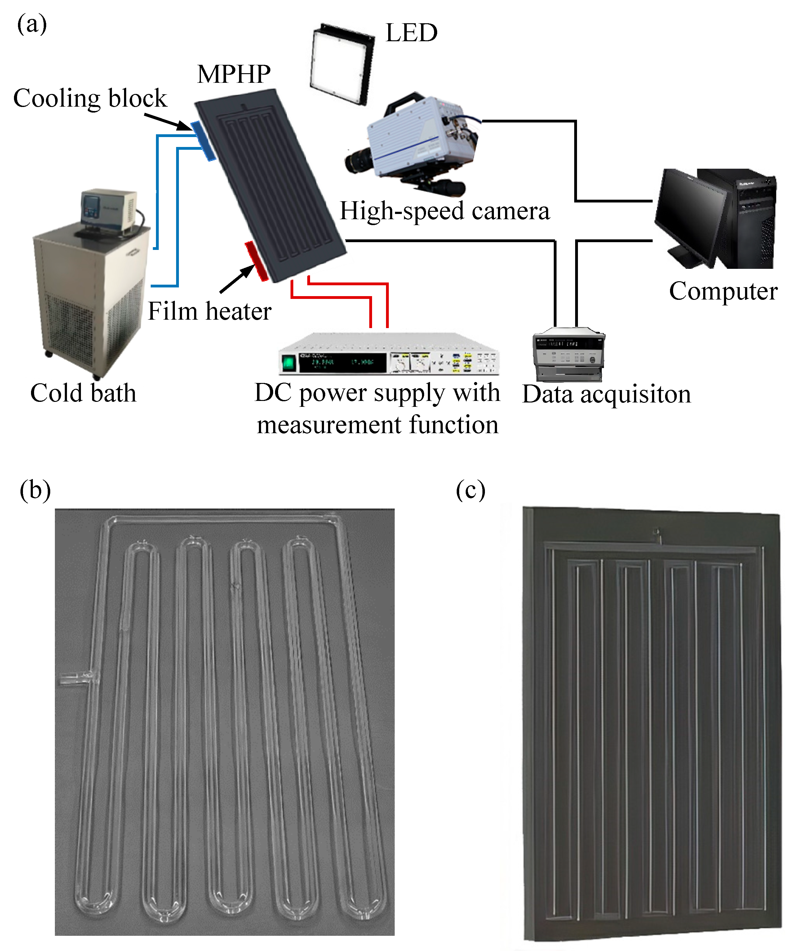 Figure 3. High-speed camera technology and its MPHP: (a) high-speed camera technology experimental system, (b) glass tube PHP, and (c) silicon substrate PHP.
