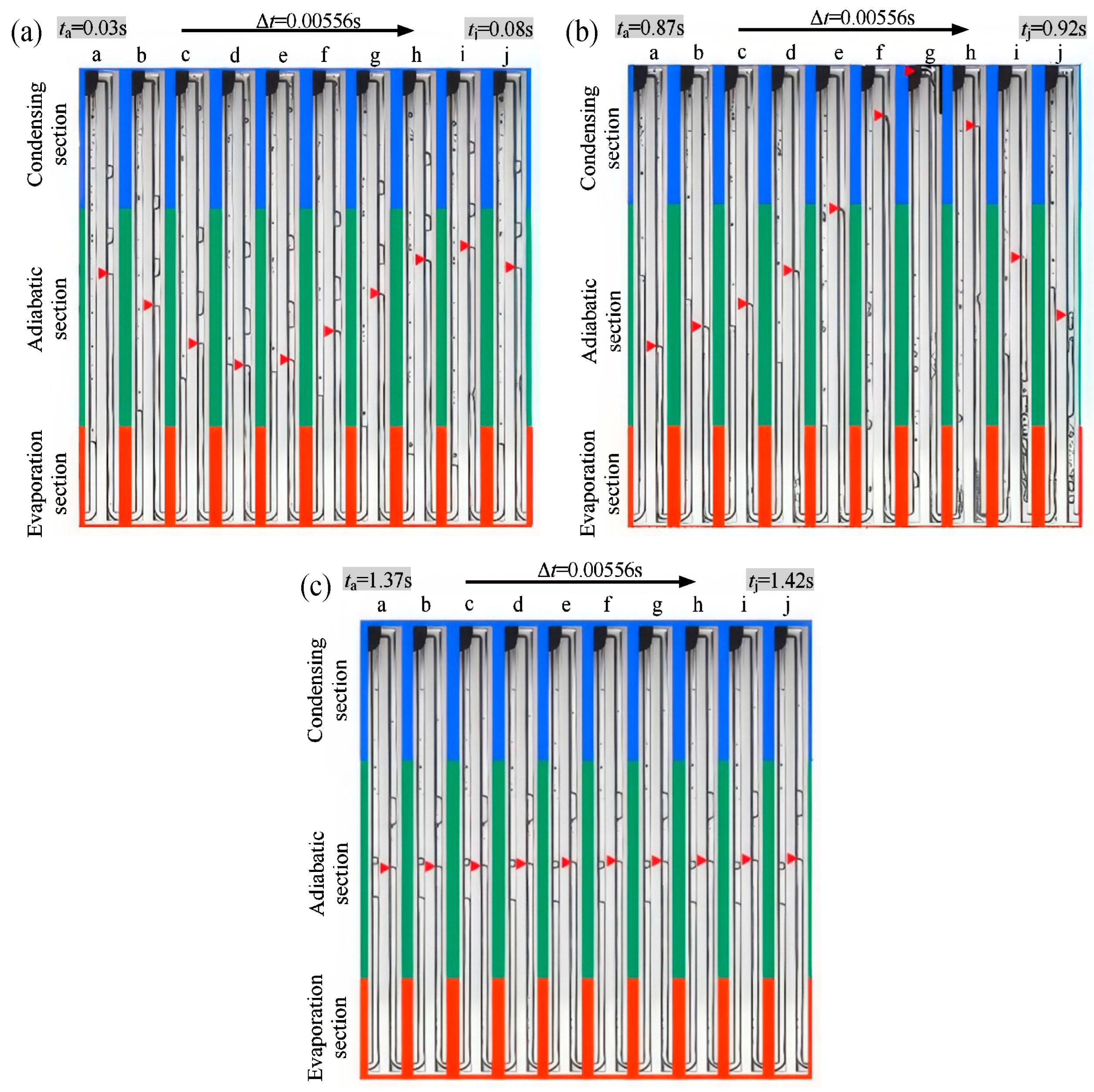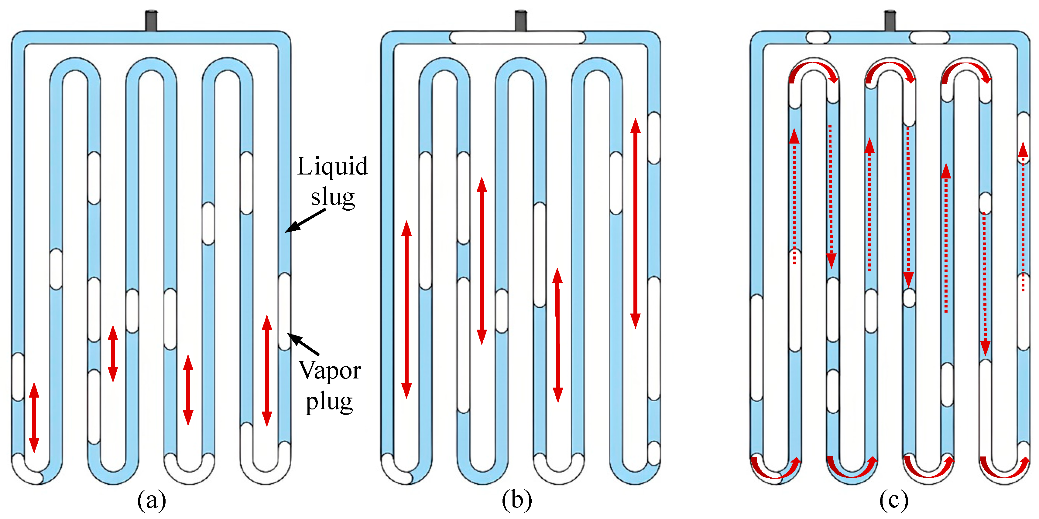 Figure 5. MPHP motion mode: (a) SO, (b) LO, and (c) stagnation. The image is sourced from the PhD dissertation of the corresponding author, Chao Wang [28]. Noted, the red arrow points to the real-time position of the gas-liquid interface.