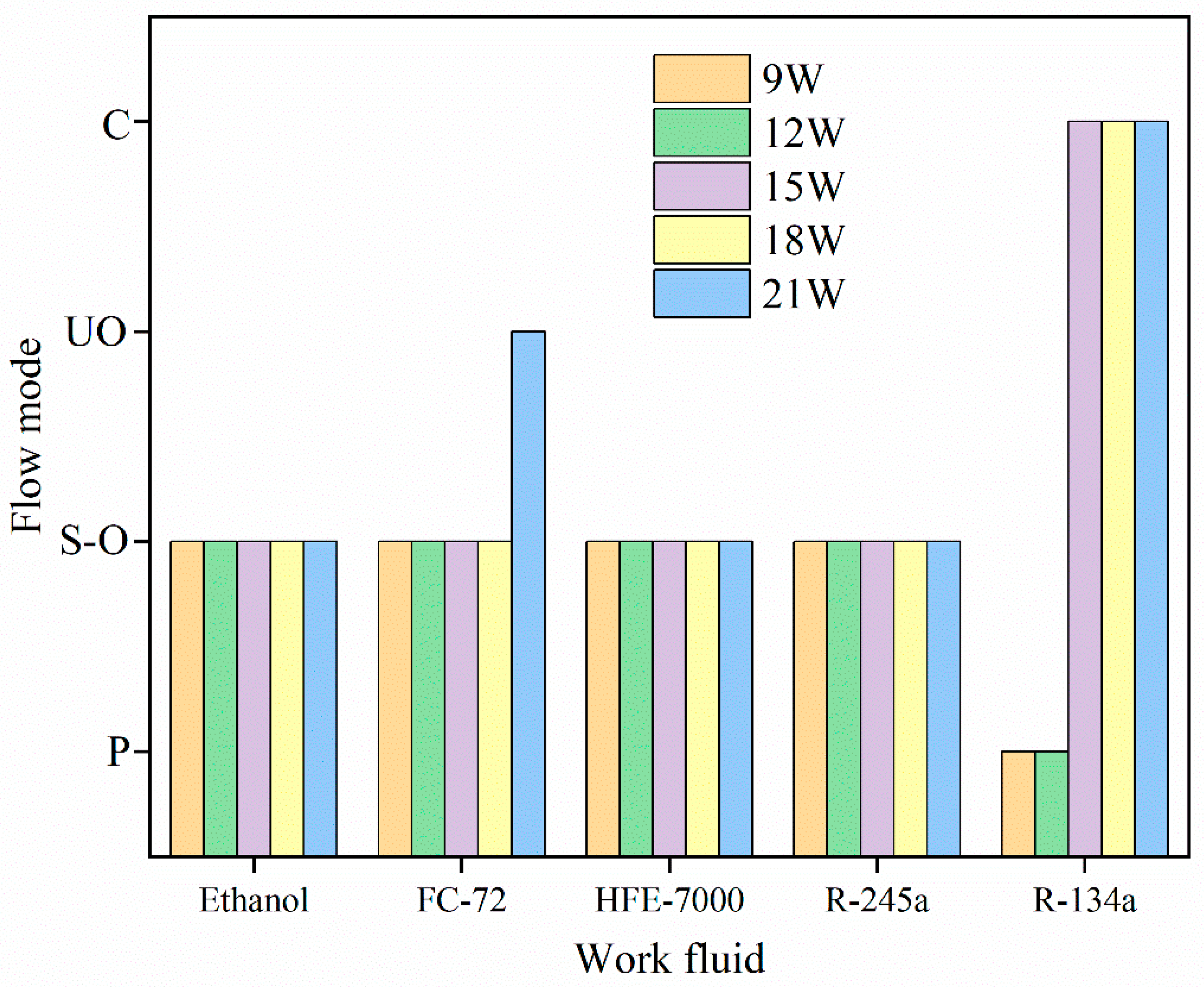 Figure 6. Flow motion patterns of various working fluids at different input powers; the data analysis is from the literature [31].