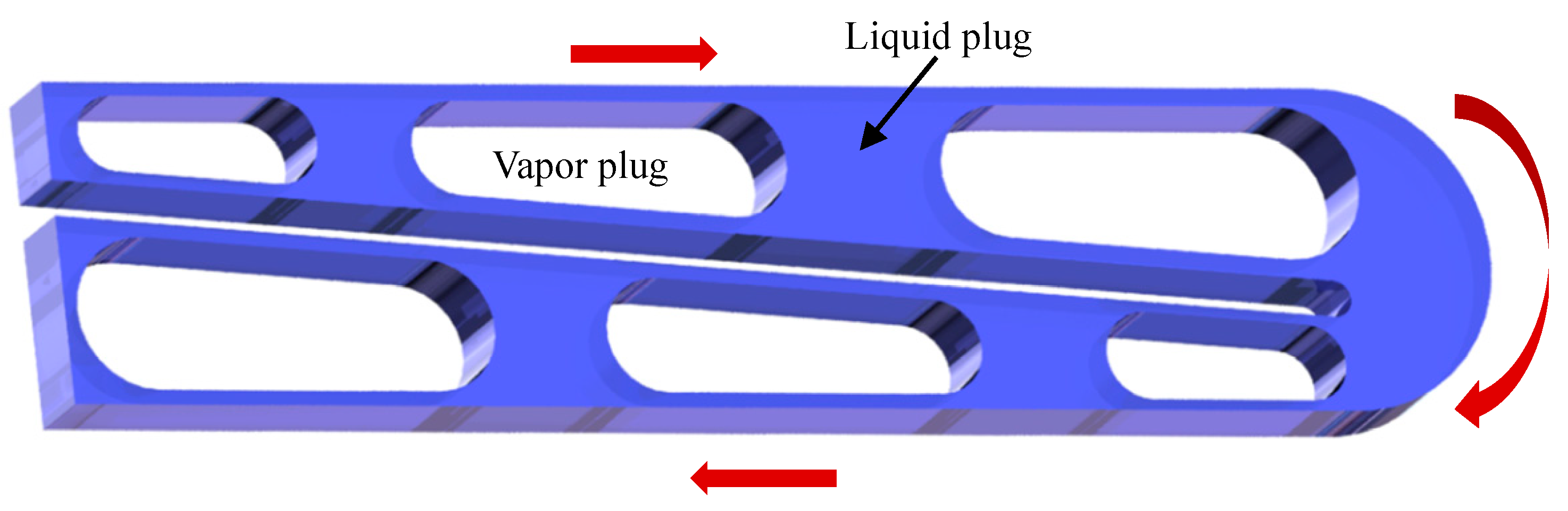 Notably, Chen et al. [43] visualized the flat-plate micro pulsating heat pipe with asymmetric converging-diverging channels (CDC-FPMPHP for short) and the flat-plate micro pulsating heat pipe with uniform rectangular channels (UC-FPMPHP for short) using high-speed imaging techniques. Their results showed that the tube’s unique structure caused fluid disruptions and wall effects that produced characteristic “dovetail-like” plug flows and “wave-like” annular flows. Wang et al. [28] performed the same work and obtained results consistent with those described above (see Figure 11).