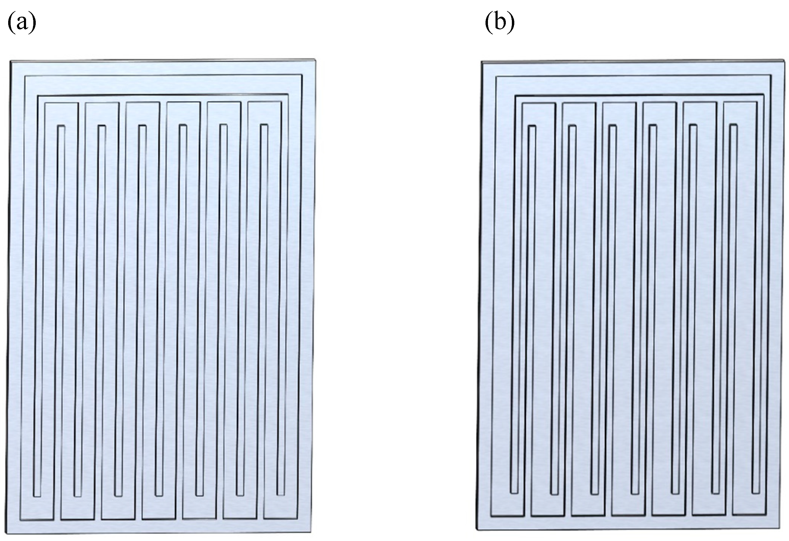 Figure 8. Uneven channel spacing design of microchannels: (a) symmetric MPHP; (b) asymmetric MPHP.