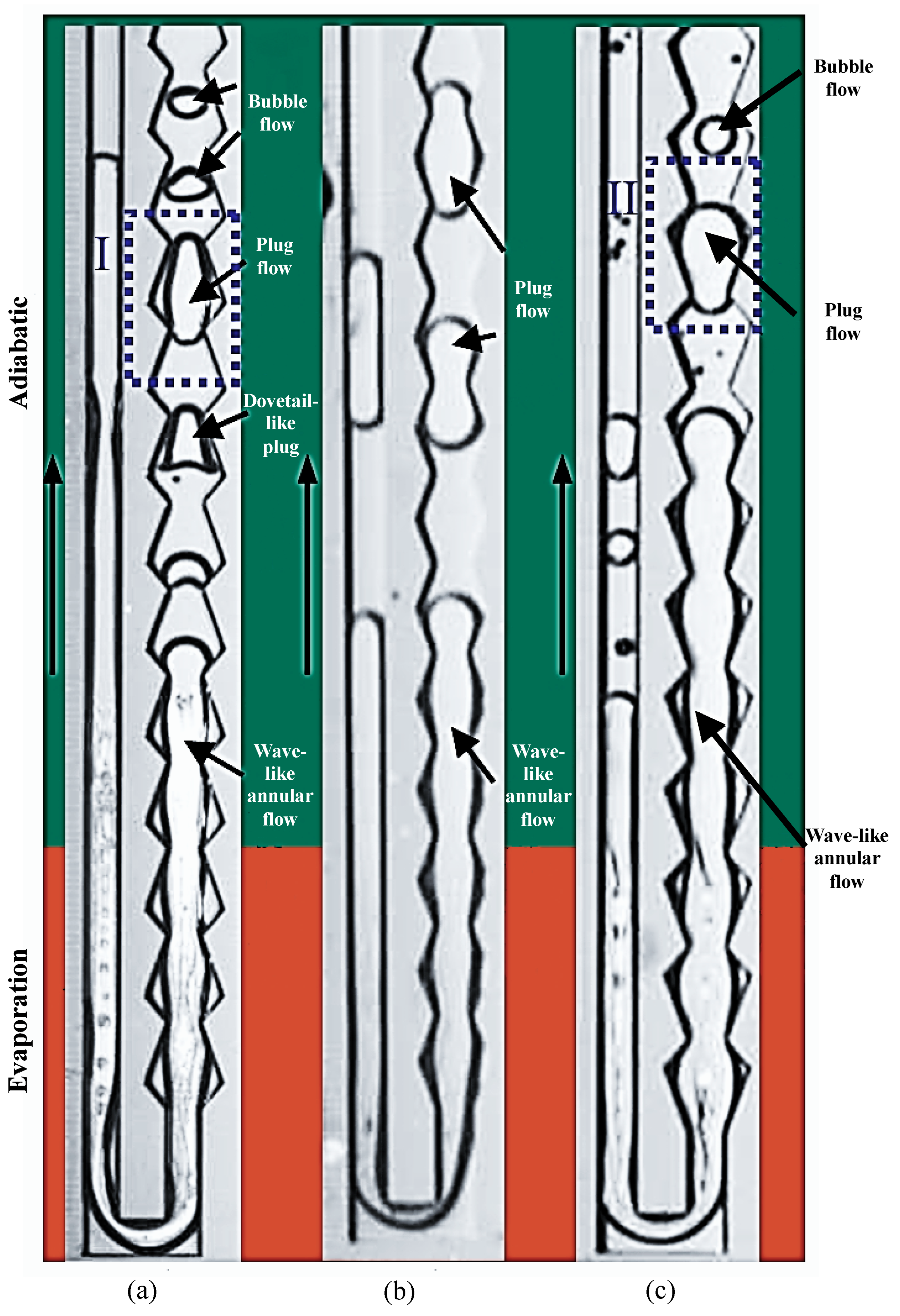 Figure 11. CDC-FPMPHP structures: (a) type A MPHP; (b) type B MPHP; and (c) type C MPHP. The image is sourced from the PhD dissertation of the corresponding author, Chao Wang [28]. Noted, the blue dotted boxes indicates different forms of plug flow, the vertical black long arrow indicates the flow direction.