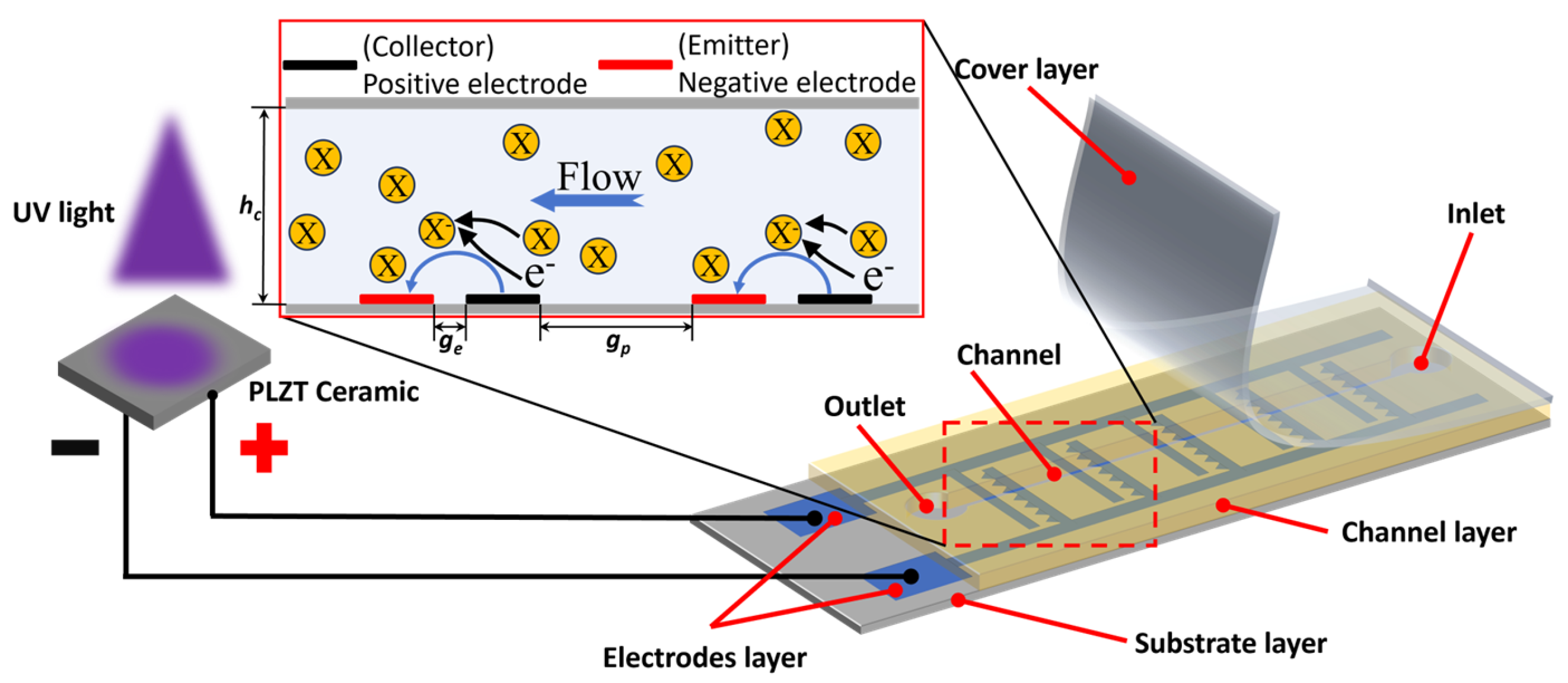 Figure 1, the pump chip’s positive and negative electrodes function as the collector and emitter, respectively. When the photoelectric field strength surpasses the energy barrier, field emission occurs, injecting electrons from the emitter into the dielectric fluid. Neutral molecules capture these electrons, forming ions. Under the photoelectric field, ions migrate toward the collector, releasing electrons and thereby driving fluid flow. Upon UV cessation, the PLZT ceases photovoltage generation, the inter-electrode field gradually dissipates, and flow stops. Thus, powered solely by PLZT-generated photovoltage, this pump operates without external power sources, offering significant miniaturization advantages. Key dimensional parameters of the pump chip are labeled in