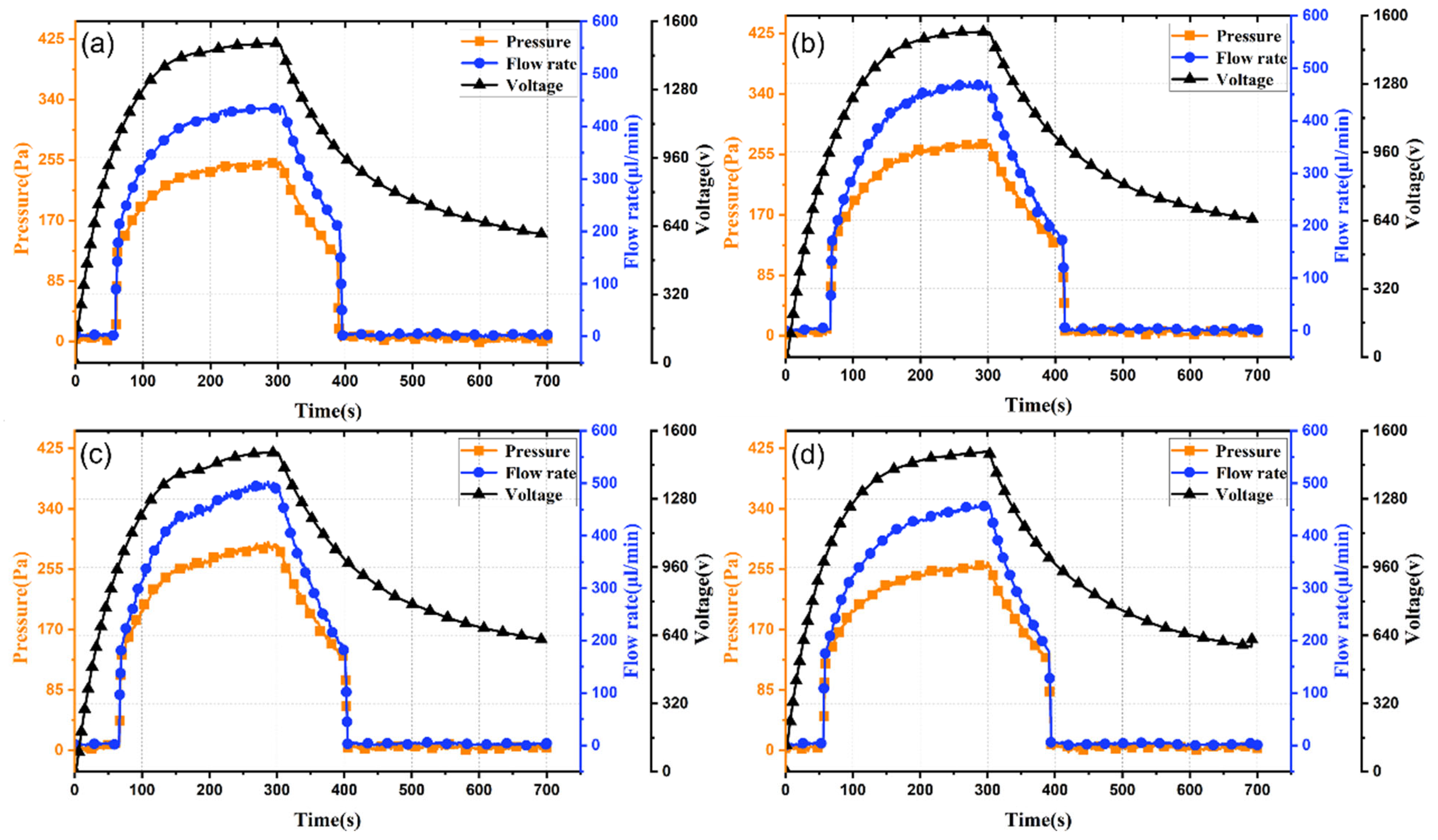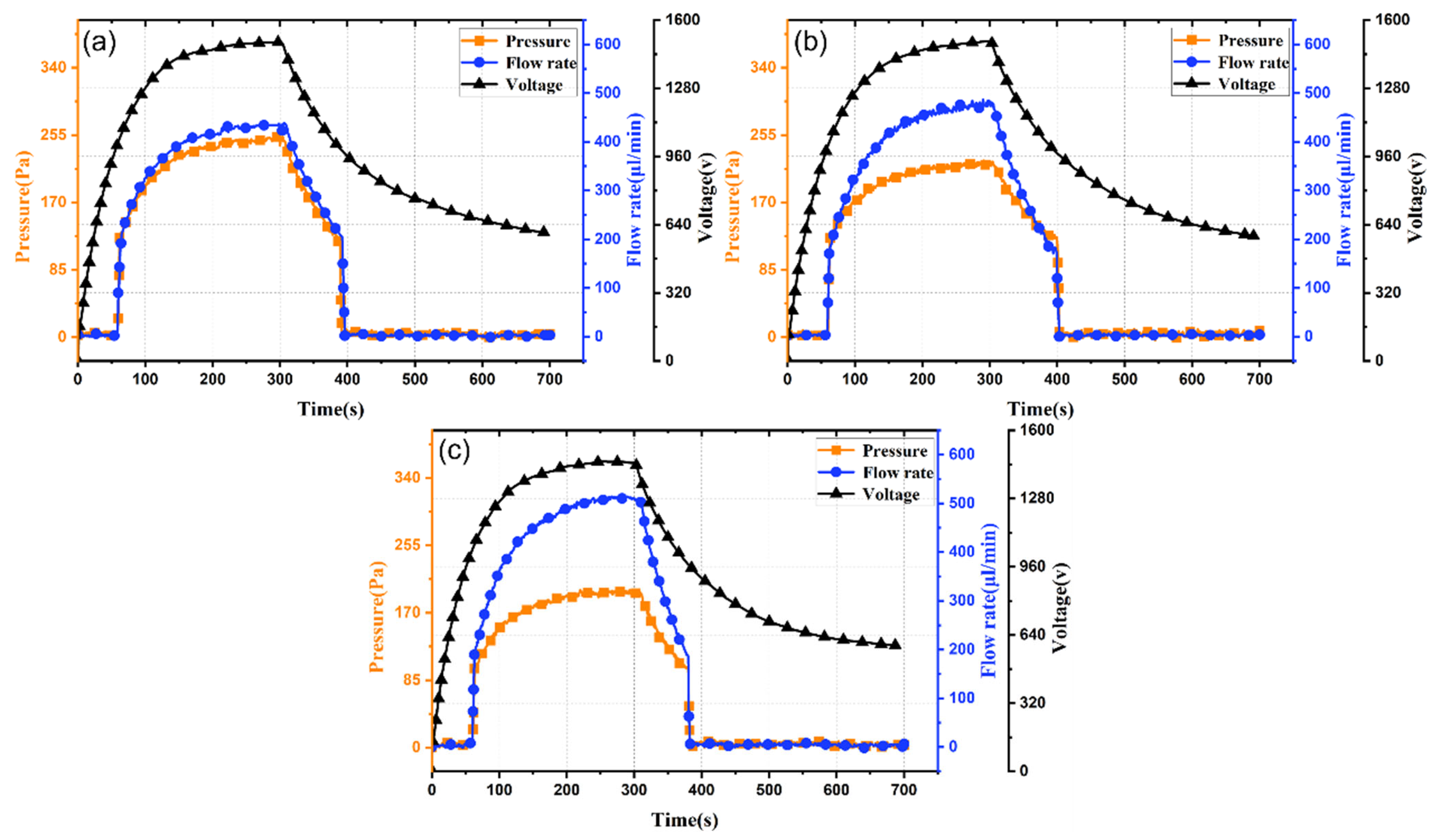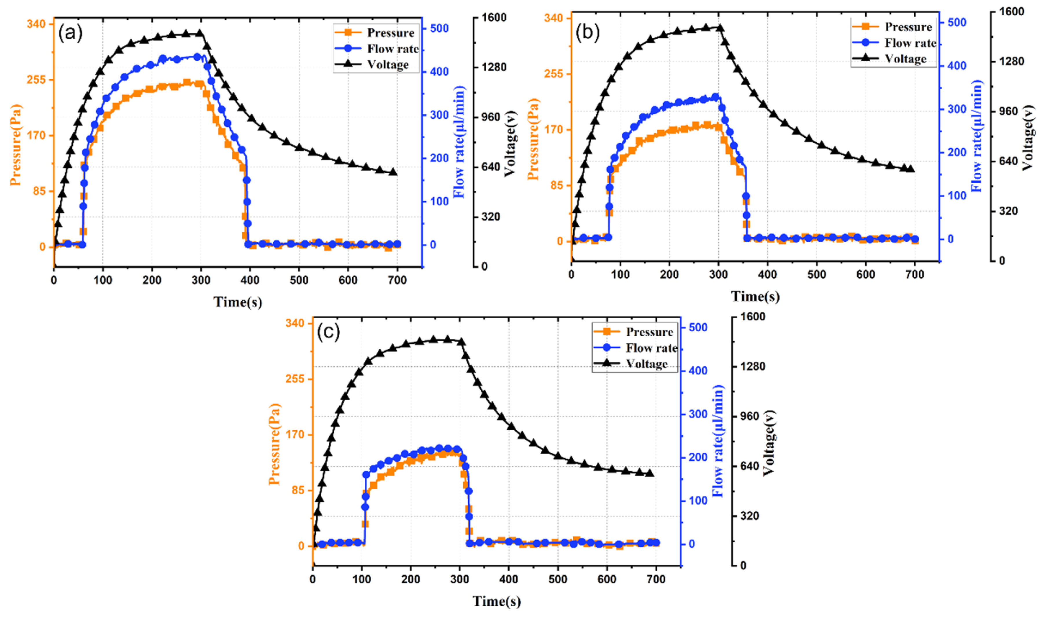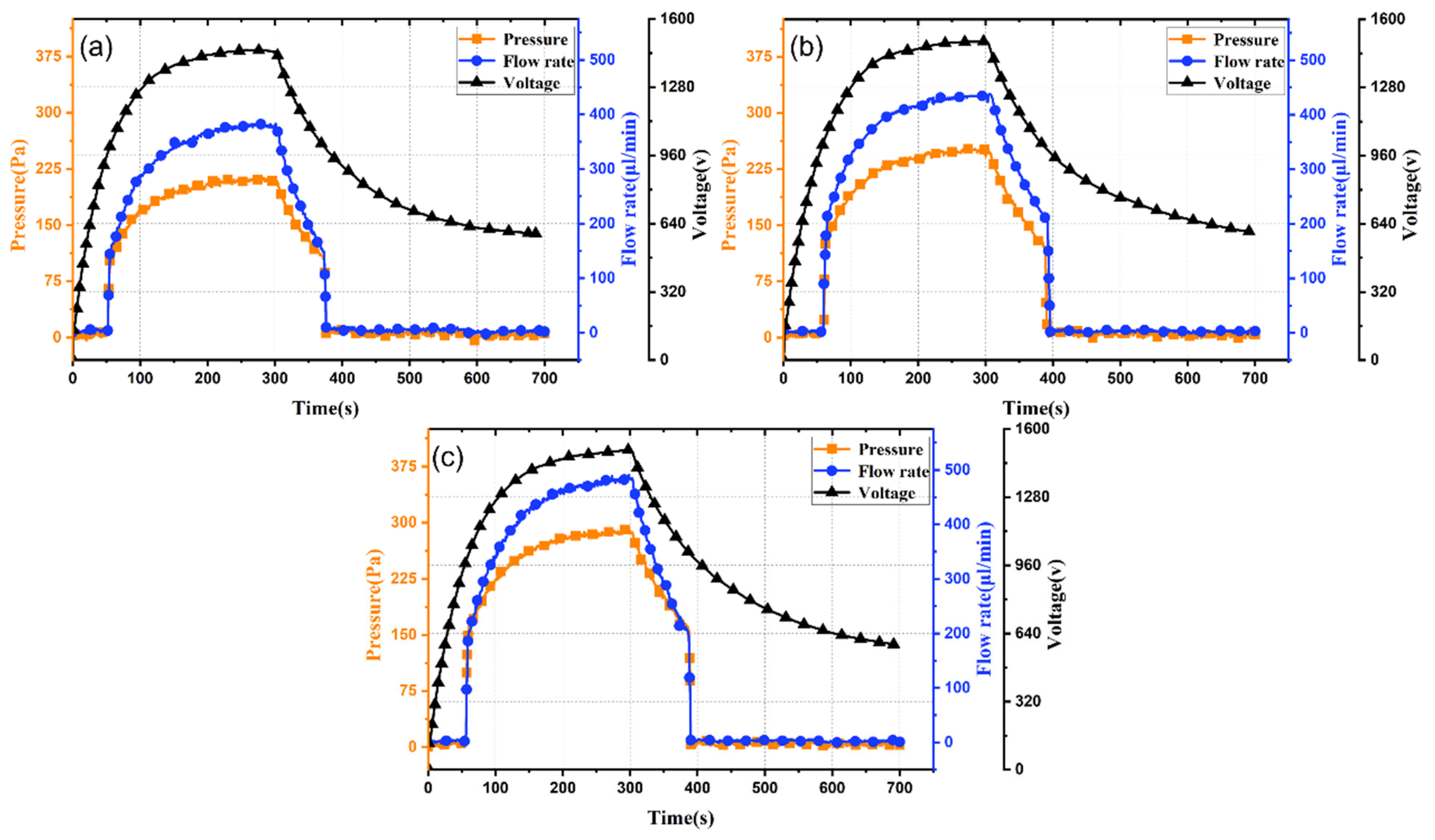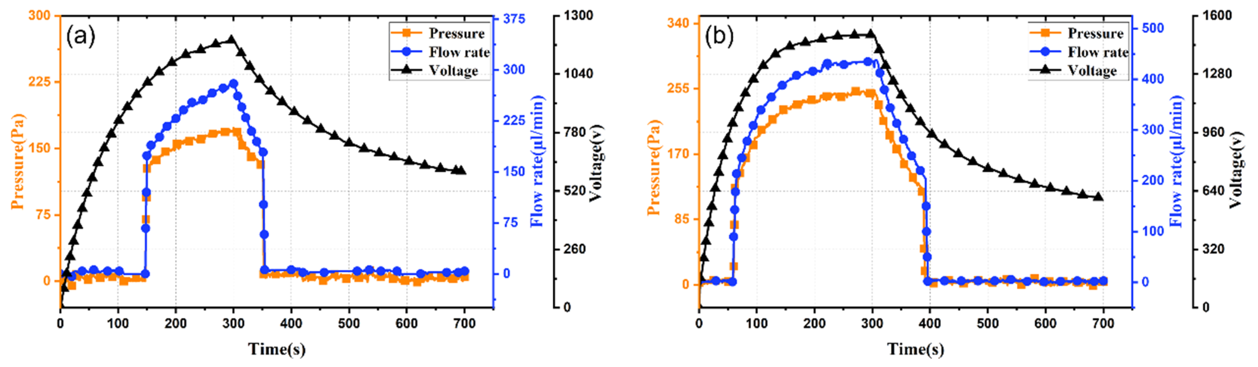 Figure 5a–c, increasing electrode spacing from 0.3 mm to 0.5 mm prolongs output response time from 57 s to 109 s. This is attributed to differing times to reach the threshold activation electric field: smaller spacing yields higher field strength under identical voltage, enabling faster response. Moreover, increasing electrode spacing from 0.3 mm to 0.5 mm reduces peak output pressure and flow rate from 0.25 kPa and 430 μL/min to 0.14 kPa and 220 μL/min (decreases of 78% and 95%, respectively). Thus, reducing electrode spacing effectively enhances output flow rate, pressure, and response speed.
