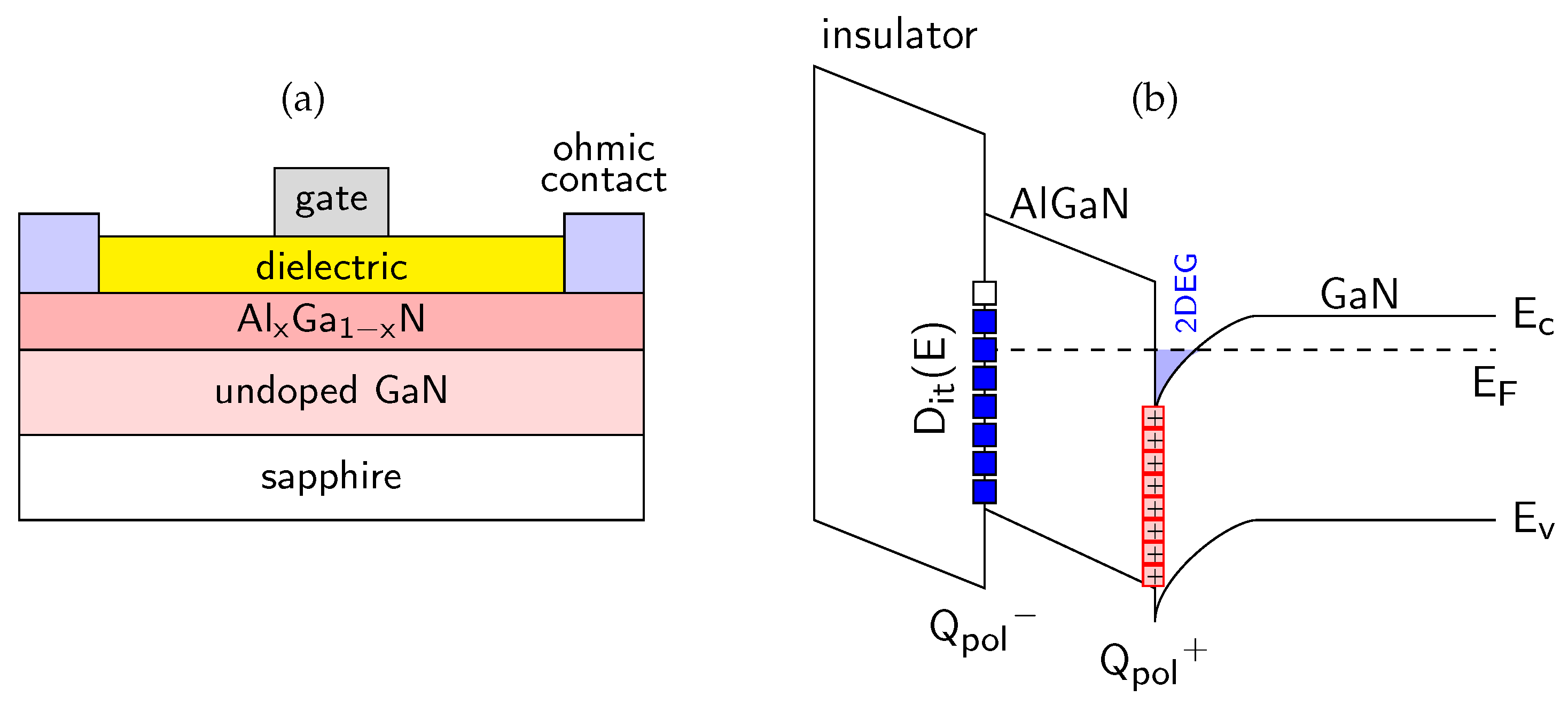 - Capriotti, M.; Alexewicz, A.; Fleury, C.; Gavagnin, M.; Bethge, O.; Visalli, D.; Derluyn, J.; Wanzenböck, H.D.; Bertagnolli, E.; Pogany, D.; et al. Fixed interface charges between AlGaN barrier and gate stack composed of in situ grown SiN and Al2O3 in AlGaN/GaN high electron mobility transistors with normally off capability. Appl. Phys. Lett. 2014, 104, 113502. [Google Scholar] [CrossRef]