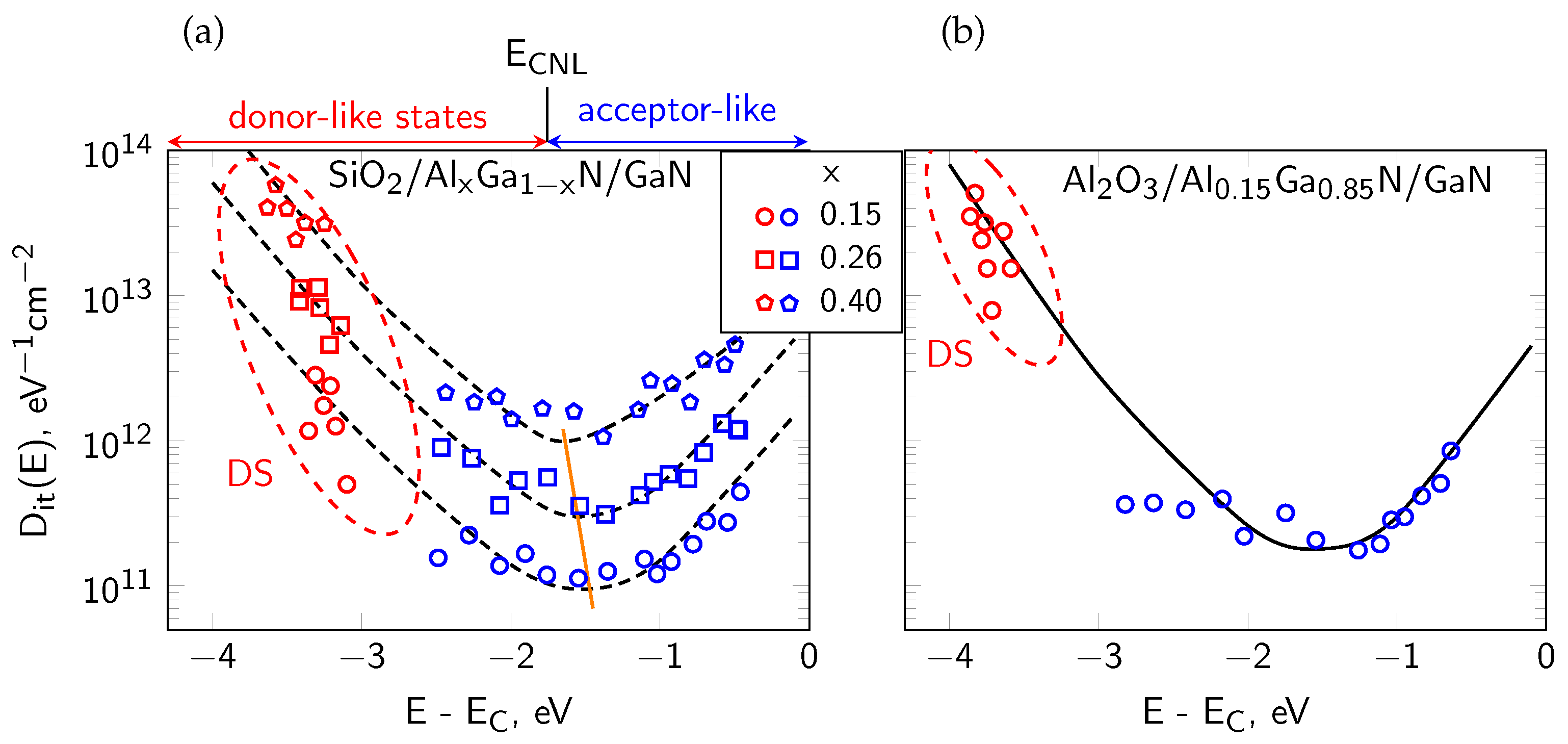 - Matys, M.; Adamowicz, B.; Hori, Y.; Hashizume, T. Direct measurement of donor-like interface state density and energy distribution at insulator/AlGaN interface in metal/Al2O3/AlGaN/GaN by photocapacitance method. Appl. Phys. Lett. 2013, 103, 021603. [Google Scholar] [CrossRef]