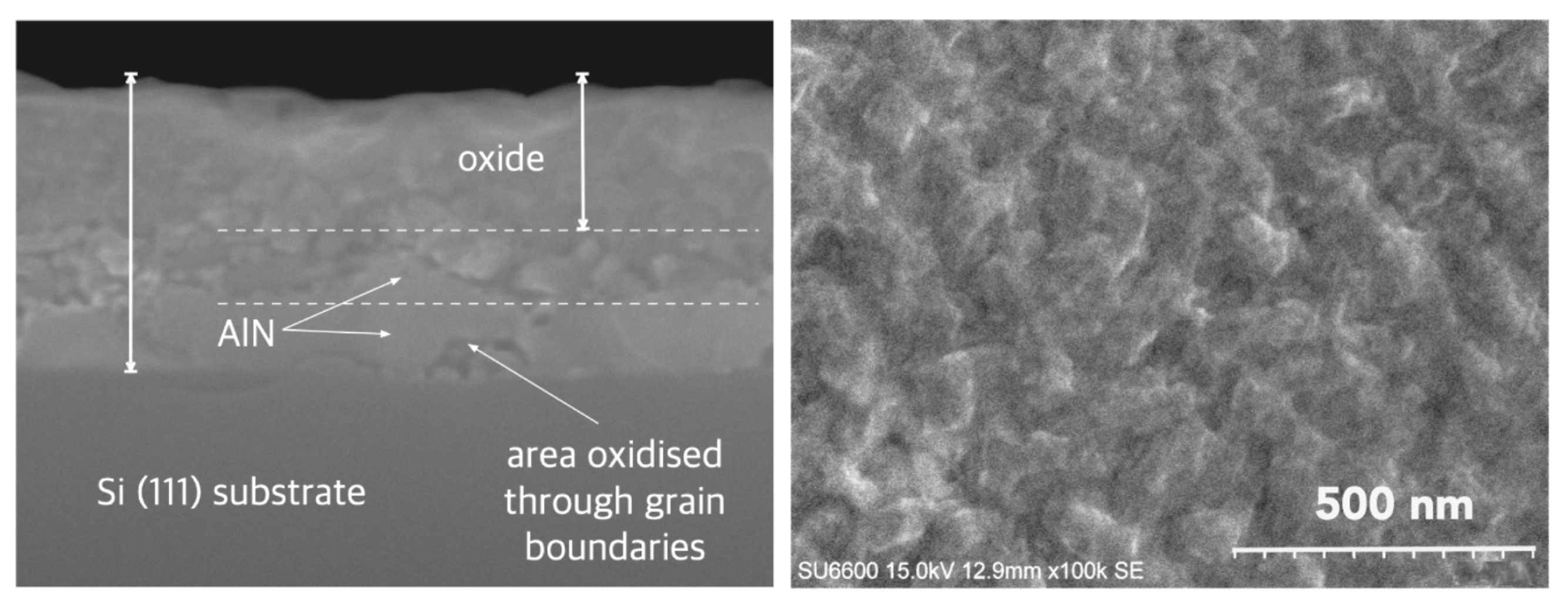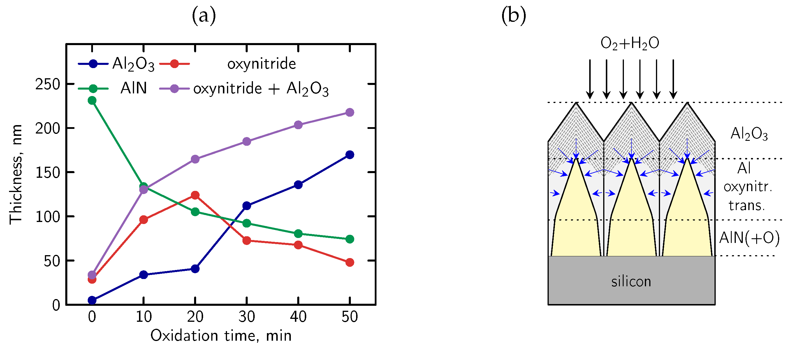 - Domanowska, A.; Korbutowicz, R.; Teterycz, H. Morphology and element composition profiles of alumina films obtained by mixed thermal oxidation of AlN epitaxial layers. Appl. Surf. Sci. 2019, 484, 1234–1243. [Google Scholar] [CrossRef]