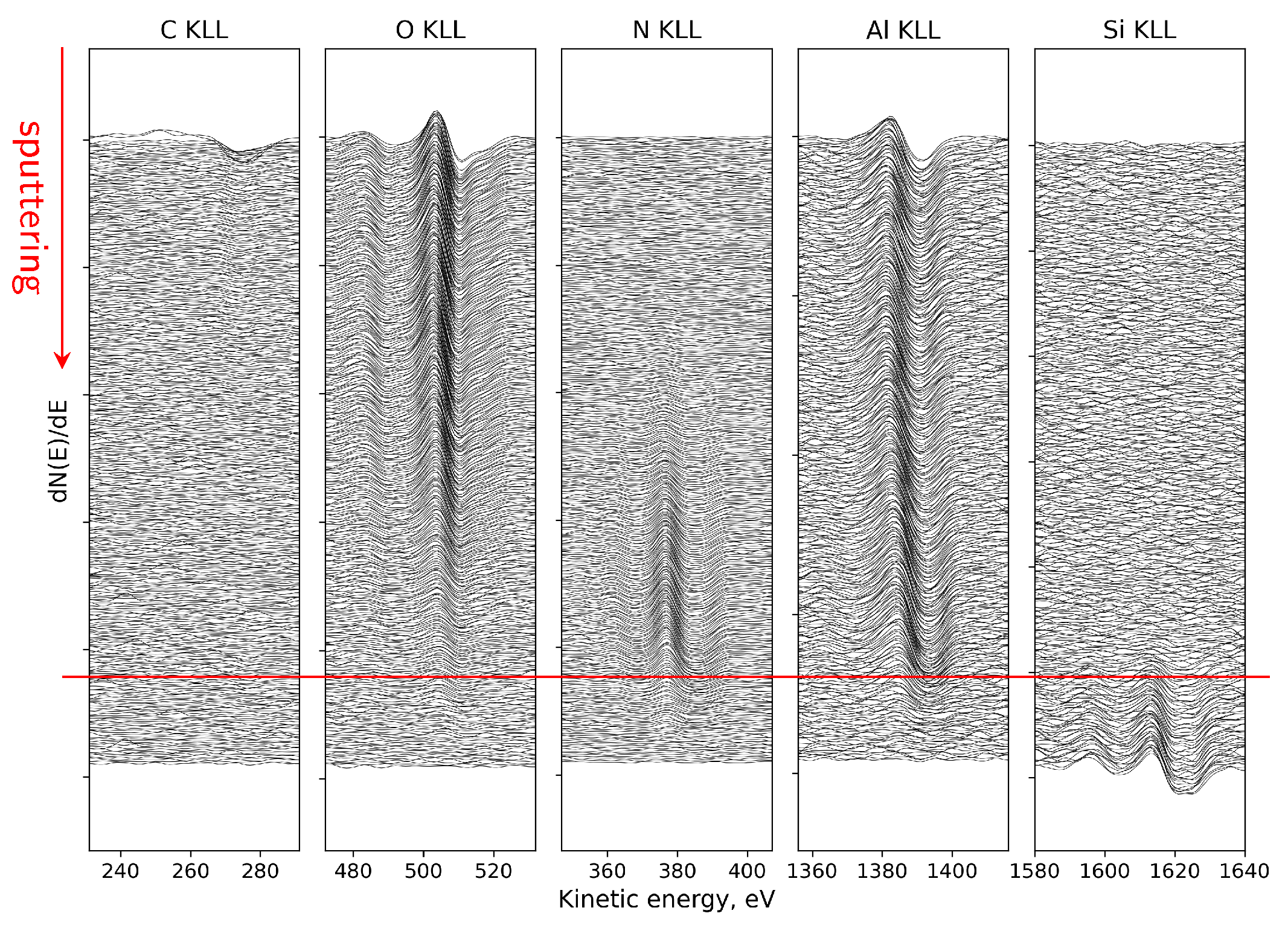 - Domanowska, A.; Adamowicz, B.; Bidziński, P.; Klimasek, A.; Szewczenko, J.; Gutt, T.; Przewłocki, H.M. Analysis of chemical shifts in Auger electron spectra versus sputtering time from passivated surfaces. Opt. Appl. 2011, 41, 441–447. [Google Scholar]