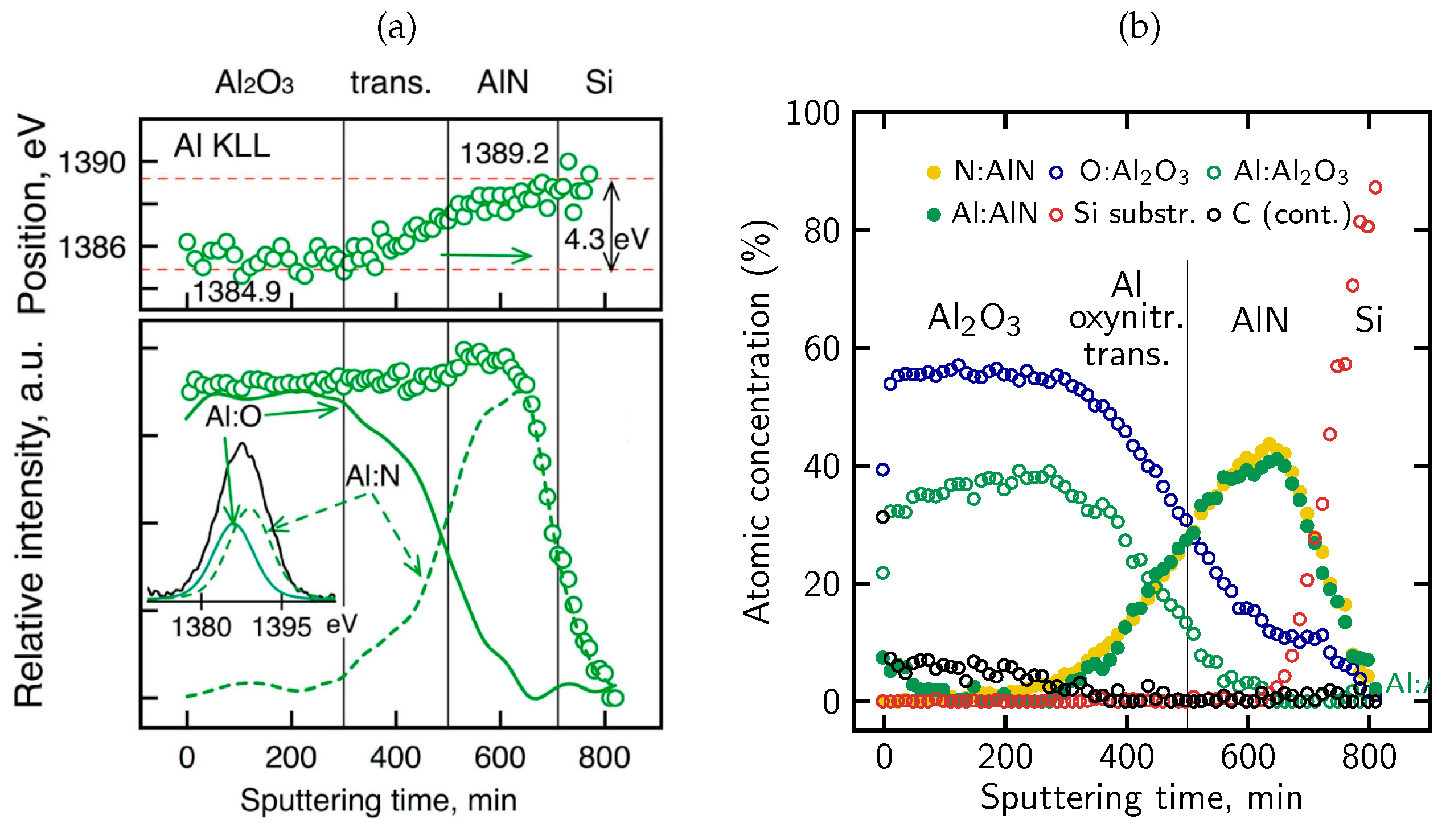 - Wang, P.W.; Sui, S.; Durrer, W.G.; Craig, J.H. Auger peak shape analysis of AlN film grown by ammonia plasma. Surf. Interface Anal. 2003, 35, 141–145. [Google Scholar] [CrossRef]