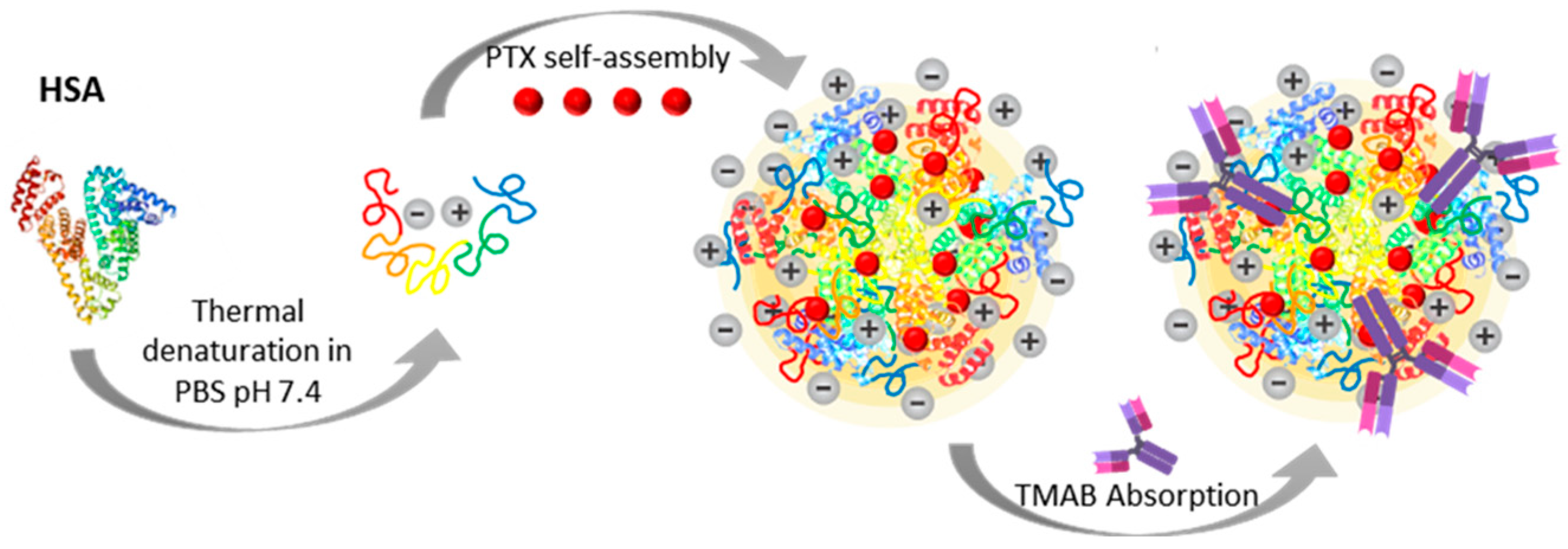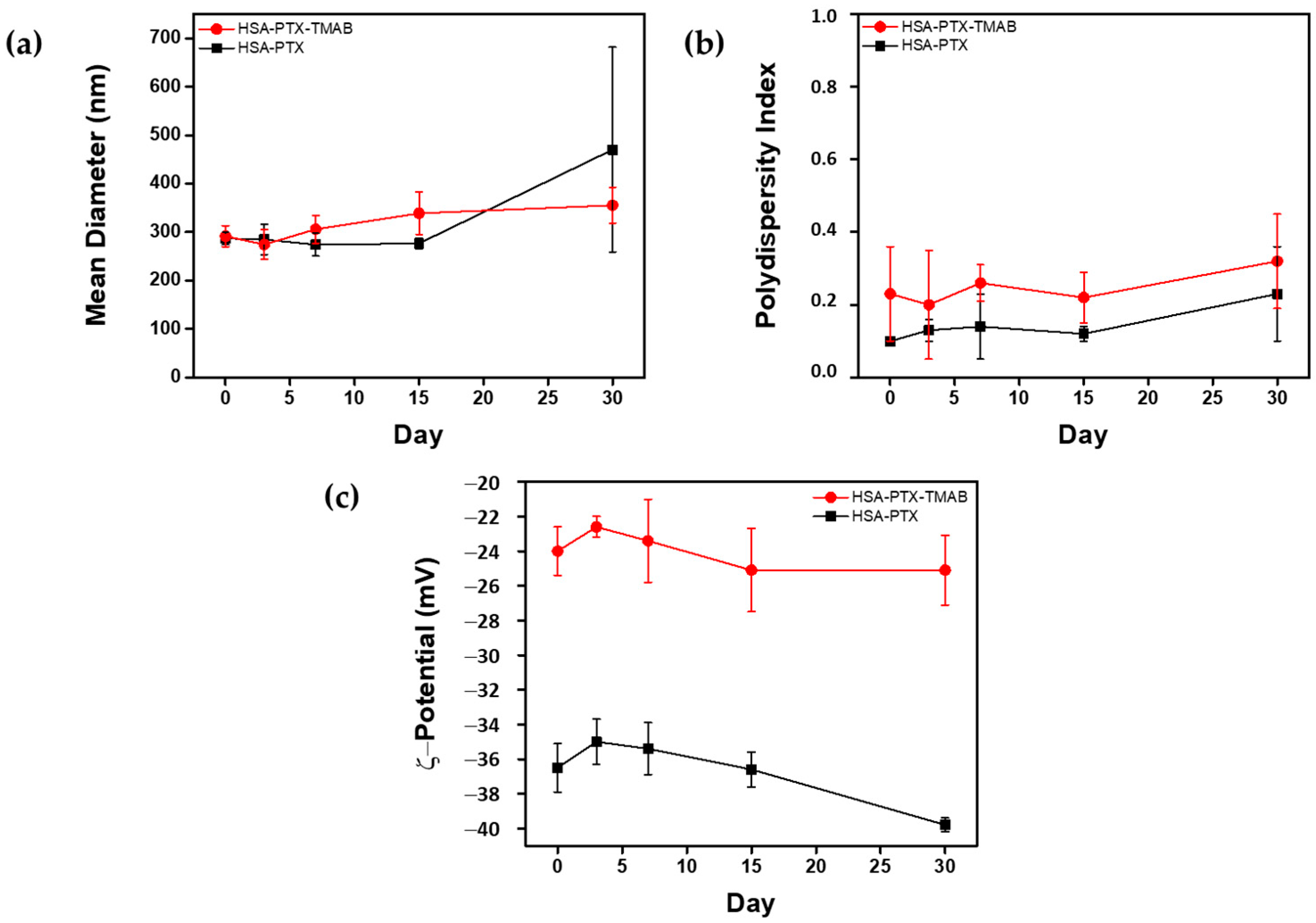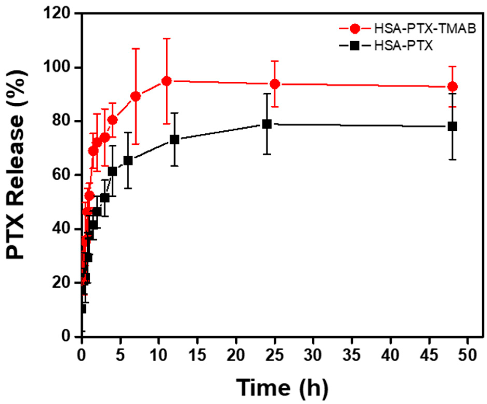 | HSA-PTX-TMAB NPs | 306.9 ± 42.2 | 0.23 ± 0.13 | −24.0 ± 1.4 |