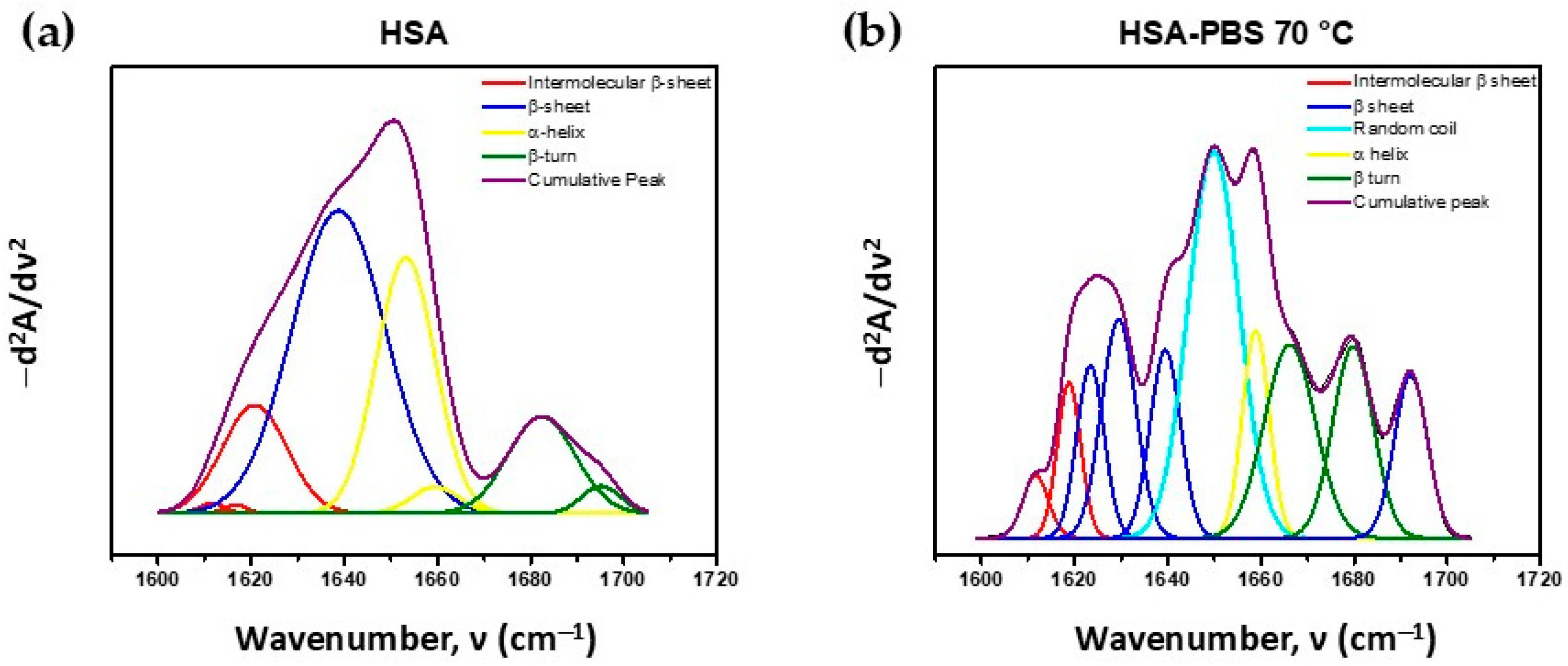 - Usoltsev, D.; Sitnikova, V.; Kajava, A.; Uspenskaya, M. Systematic FTIR spectroscopy study of the secondary structure changes in human serum albumin under various denaturation conditions. Biomolecules 2019, 9, 359. [Google Scholar] [CrossRef]