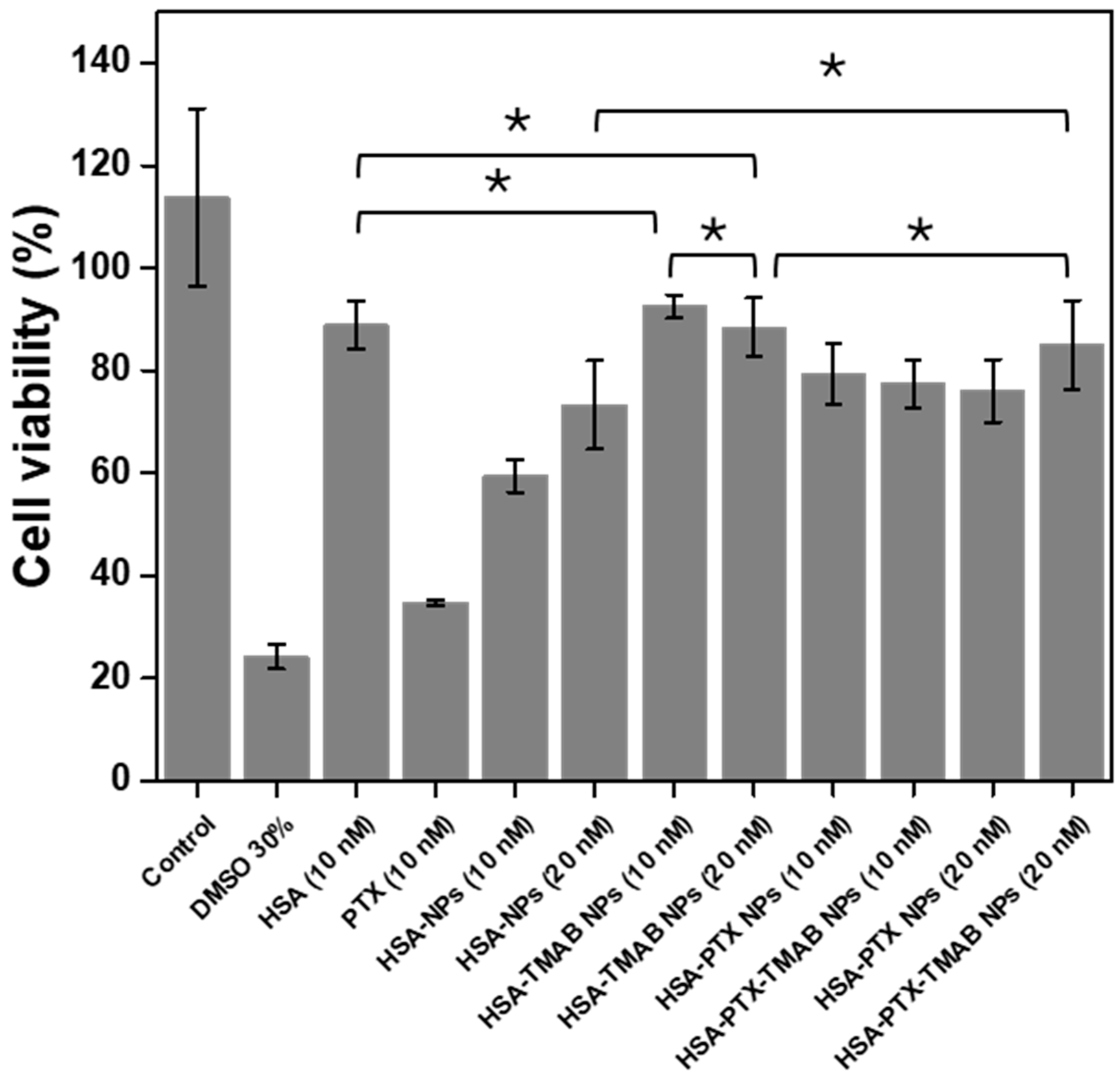 | HSA-PTX-TMAB NPs | 98.2 ± 3.5 | 7.4 ± 1.5 | 130.9 ± 4.6 | 250 * |