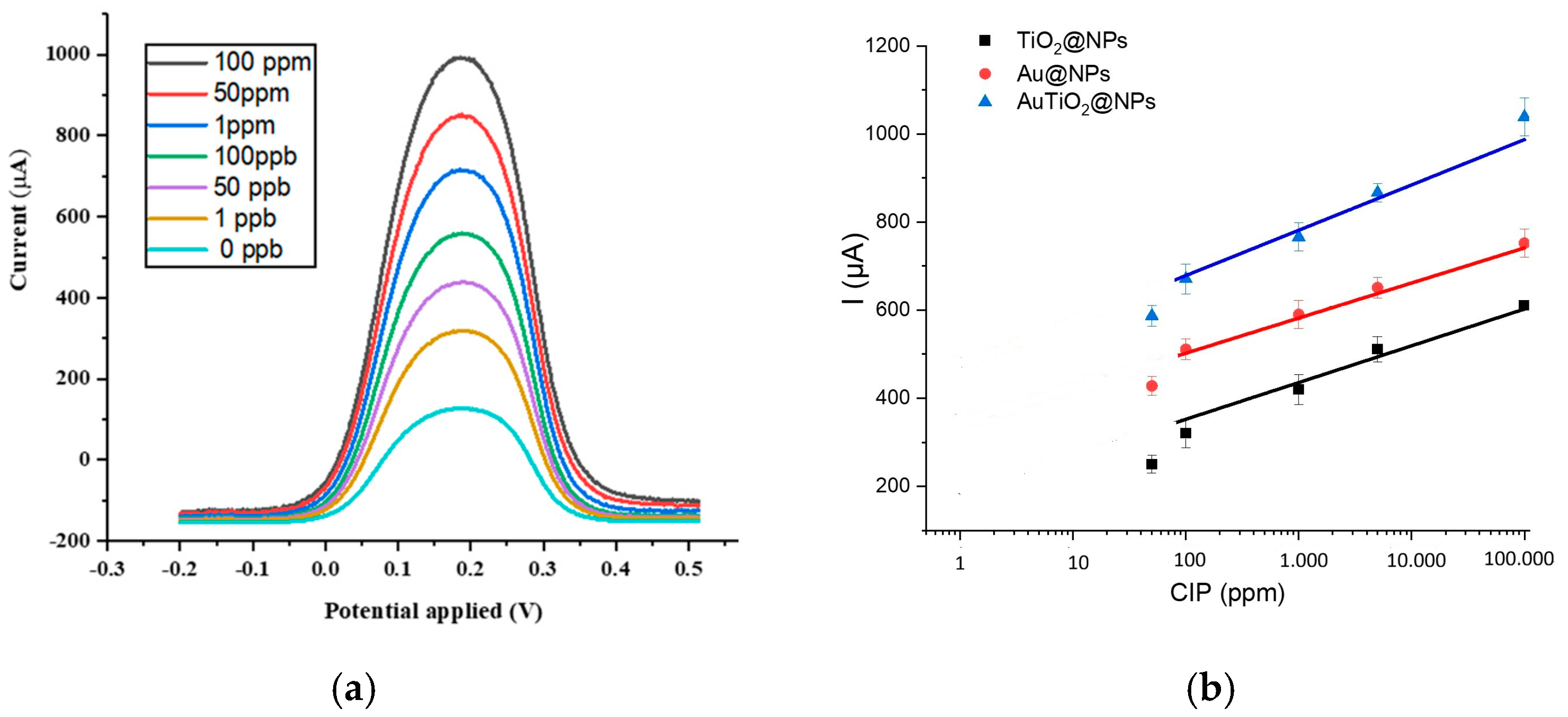 - Zhao, J.; Huang, P.; Jin, W. Electrochemical sensor based on TiO2/polyvinyl alcohol nanocomposite for detection of ciprofloxacin in rainwater. Int. J. Electrochem. Sci. 2021, 16, 211018. [Google Scholar] [CrossRef]