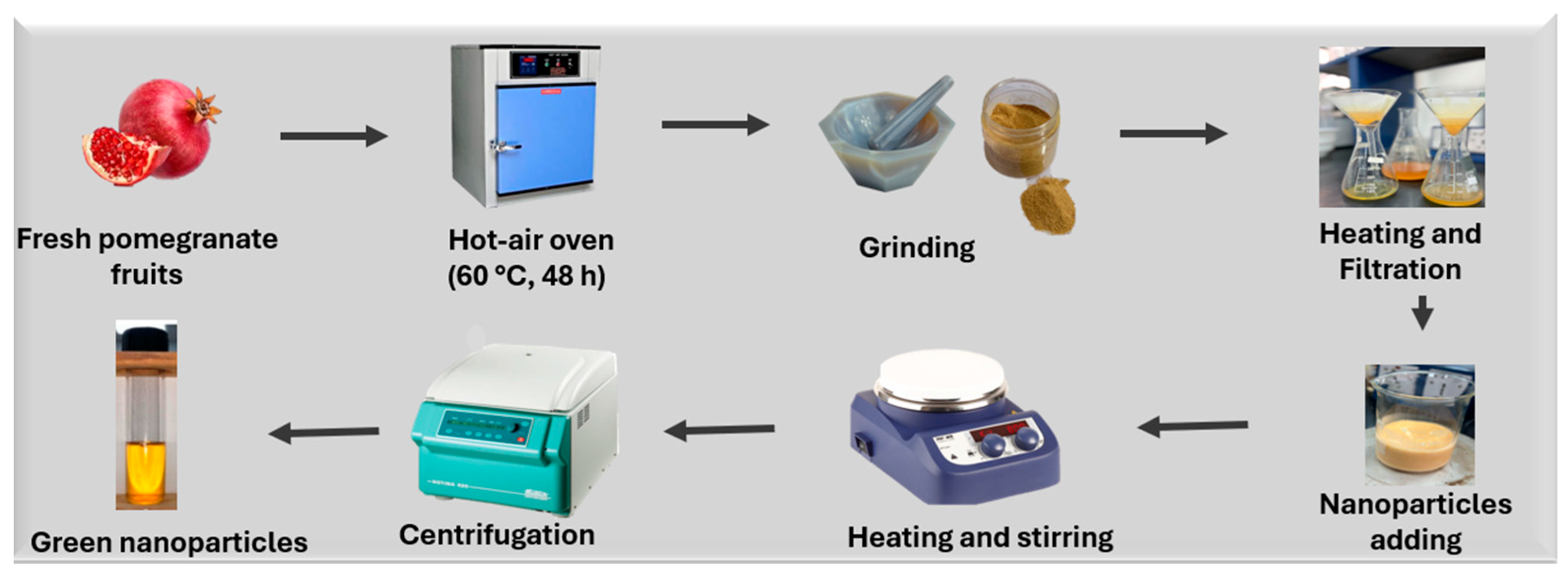 - Farouk, S.M.; Abu-Hussien, S.H.; Abd-Elhalim, B.T.; Mohamed, R.M.; Arabe, N.M.; Hussain, A.A.T.; Mostafa, M.E.; Hemdan, B.; El-Sayed, S.M.; Bakry, A.; et al. Biosynthesis and characterization of silver nanoparticles from Punica granatum (pomegranate) peel waste and its application to inhibit foodborne pathogens. Sci. Rep. 2023, 13, 19469. [Google Scholar] [CrossRef]