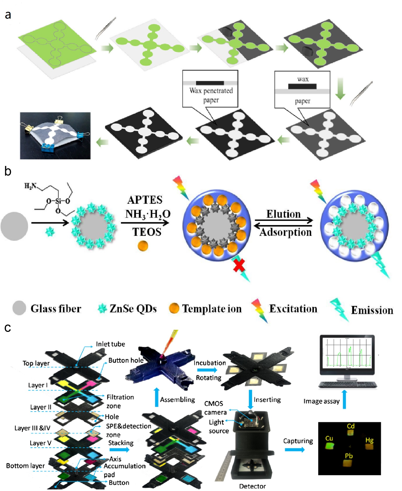 - Zhou, J.; Li, B.; Qi, A.; Shi, Y.; Qi, J.; Xu, H.; Chen, L. ZnSe quantum dot based ion imprinting technology for fluorescence detecting cadmium and lead ions on a three-dimensional rotary paper-based microfluidic chip. Sens. Actuators B Chem. 2020, 305, 127462. [Google Scholar] [CrossRef]