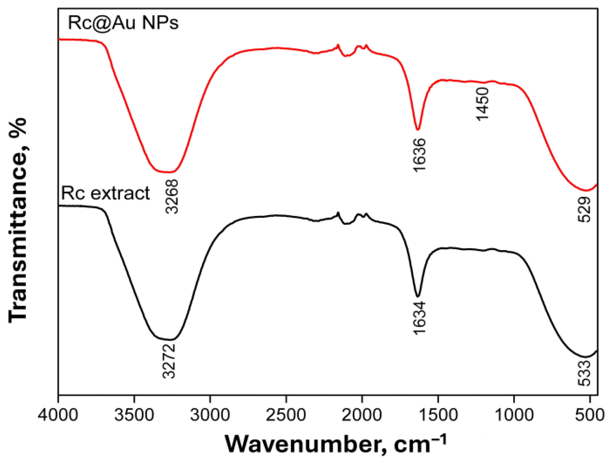 2.2. Gold Nanoparticles (Rc@AuNPs) Synthesis