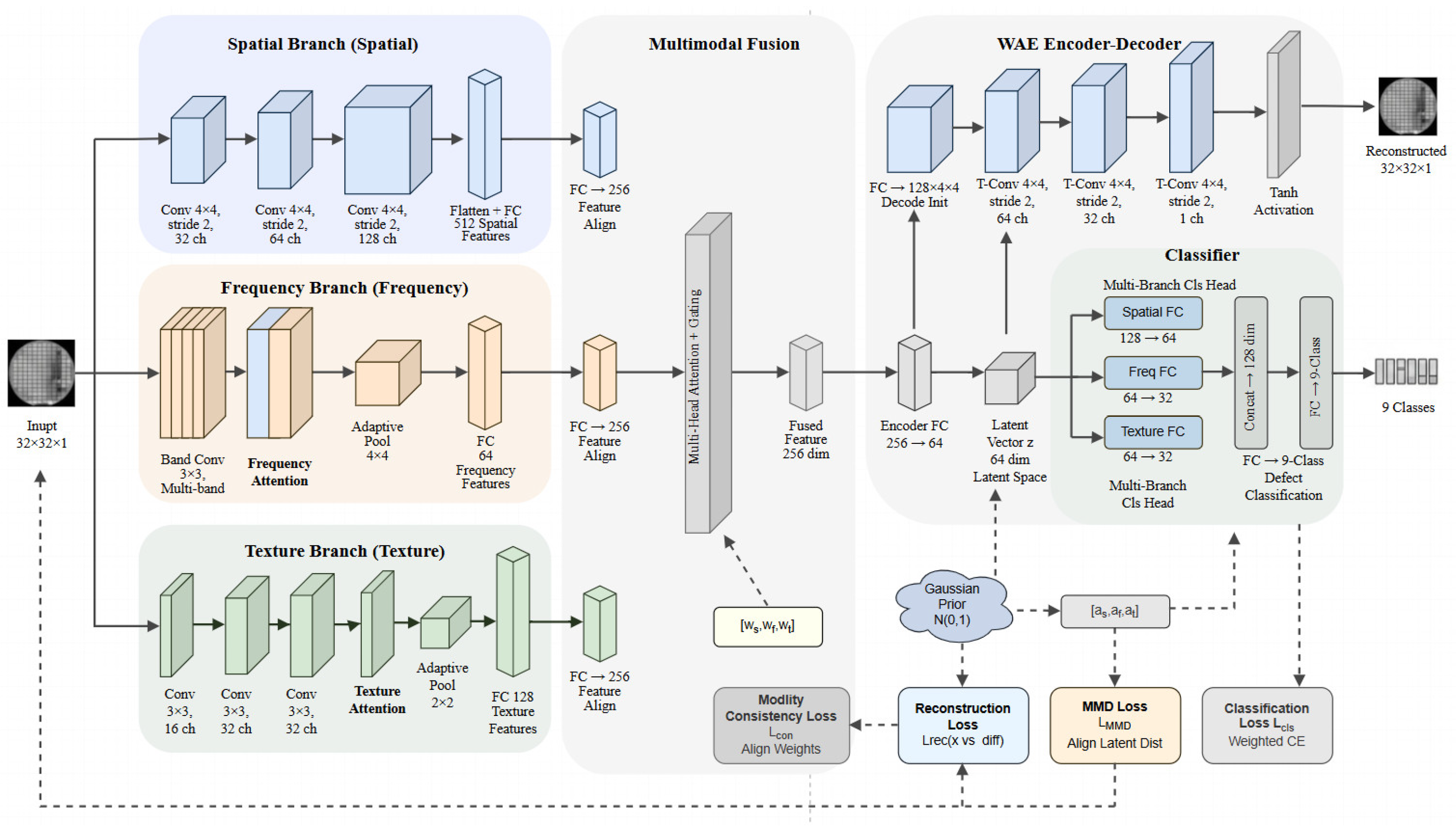 Existing studies have mainly focused on multi-scale and multi-feature fusion within a single wafer image modality. Some methods combine deep features with hand-crafted descriptors (e.g., Radon transform, image moments, statistical features) or jointly train on real wafer maps and samples generated by generative models. These approaches typically perform shallow fusion at the modality level, using feature concatenation or channel-wise weighting, with limited explicit modeling of cross-modal interactions (e.g., between spatial and frequency domains, or between image data and process parameters). Although generative latent-space models, such as autoencoders and variational autoencoders (VAEs), have been explored to address these challenges, they struggle with complex defect patterns and class imbalance. While VAEs reconstruct wafer maps unsupervised and capture global structural information, they fail to model intricate defect patterns fully. Specifically, class imbalance in wafer maps results in poor decision boundary alignment, hindering minority defect detection and affecting model stability.