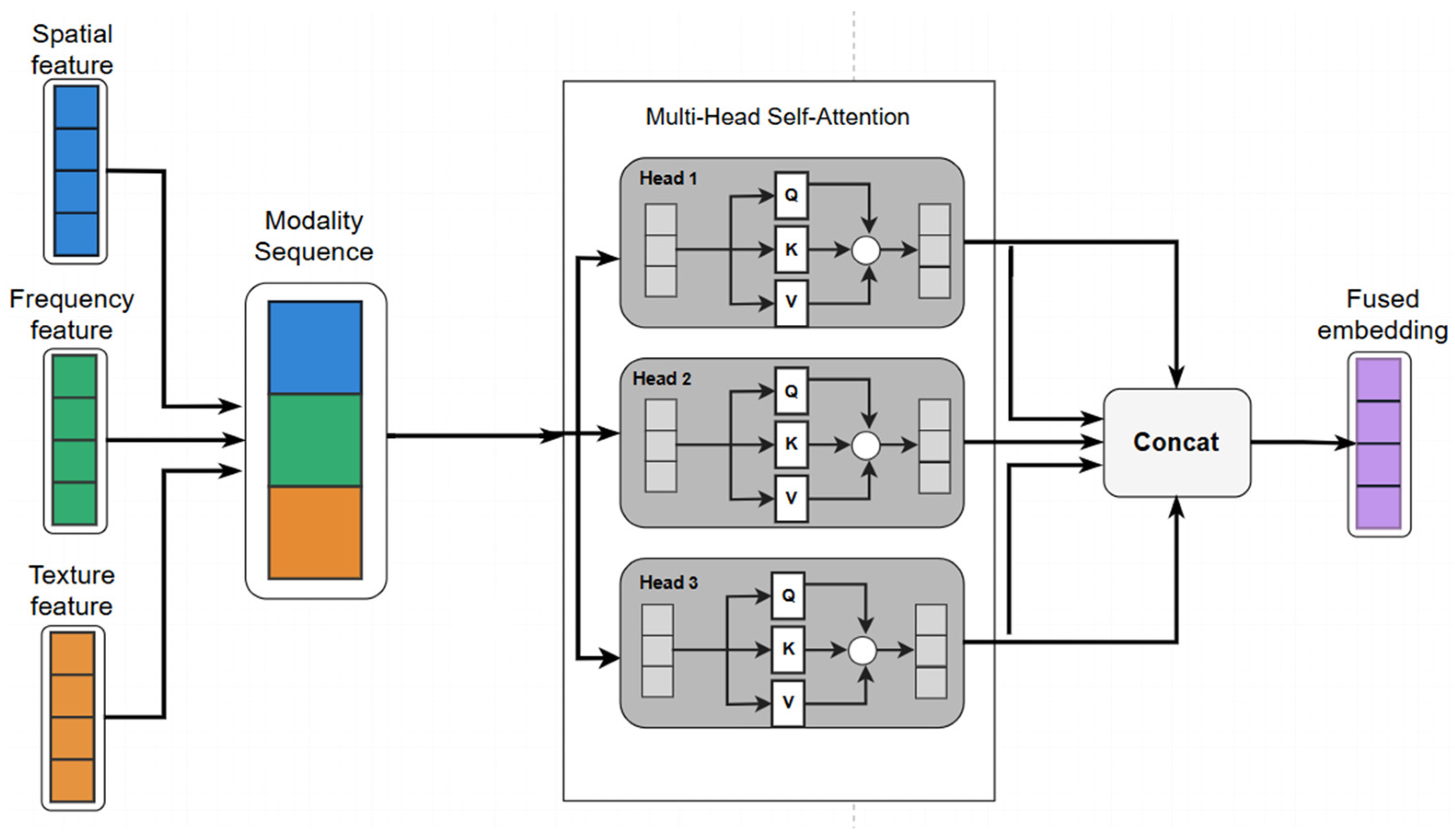 A multi-head self-attention (MHA) module is applied to model interactions among different feature representations: