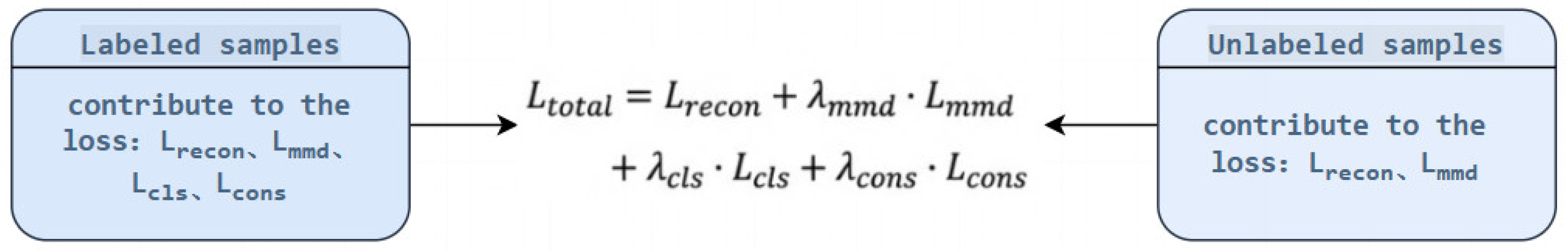 For labeled mini-batches, all four loss terms are computed on samples from , optimizing both reconstruction and classification. For unlabeled mini-batches, only and are evaluated on . This allows the reconstruction and distribution-matching constraints to guide the encoder in learning more discriminative latent representations, without relying on potentially erroneous pseudo-labels. During optimization, we use the Adam optimizer with gradient clipping to prevent gradient explosion.