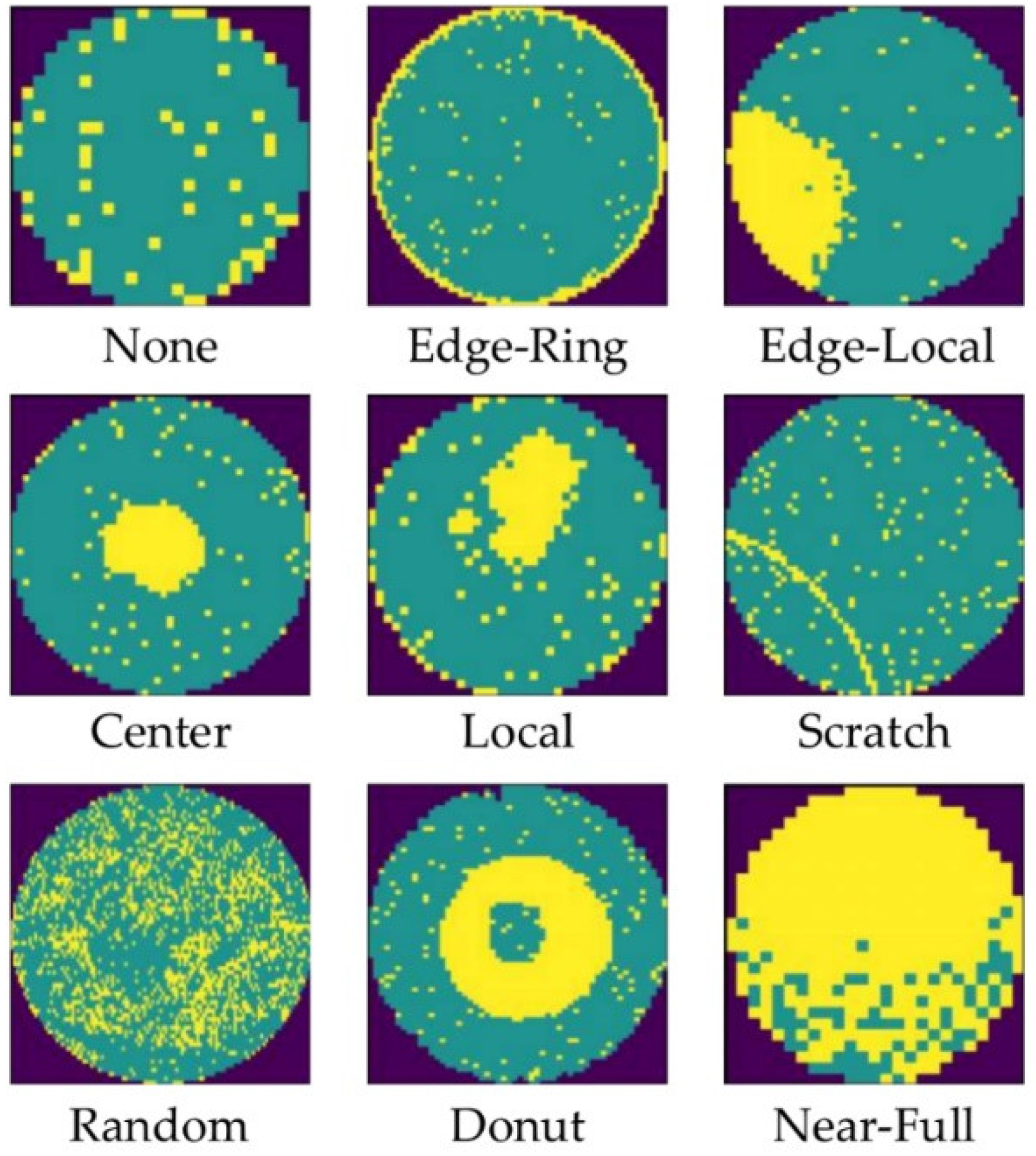 In this study, we evaluate the effectiveness of the proposed method on the publicly available WM811K wafer defect dataset. WM811K, the largest publicly available wafer map dataset, contains 811,457 maps collected from real semiconductor production lines. The dataset includes eight defect patterns (Center, Donut, Edge-Ring, Edge-Loc, Loc, Random, Scratch, Near-Full) and a defect-free category (None). Examples from the dataset are shown in